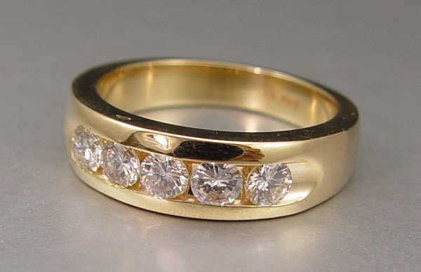 14K GOLD 1CT 5 STONE ANNIVERSARY OR WEDDING BAND: 14K yellow gold band contains five round brilliant cut diamonds. Weight: 1.00 Ct. Approx. The diamonds average VS in clarity and H-I in color. The diamonds are channel set. Weight: 7.5 grams. Size: 8 Est. $800/1000**