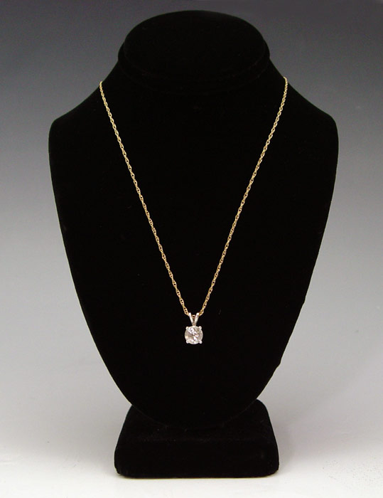 14K .65 CT. OLD EURO DIAMOND SOLITAIRE PENDANT: 14K yellow gold pendant contains one old European round cut diamonds. Rated I1 in clarity and K in color. The diamond is prong set. 16'' fine rope chain. Weight: 1.5 grams.