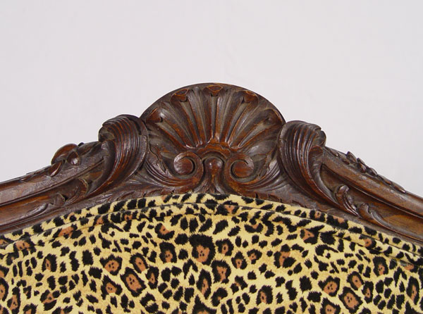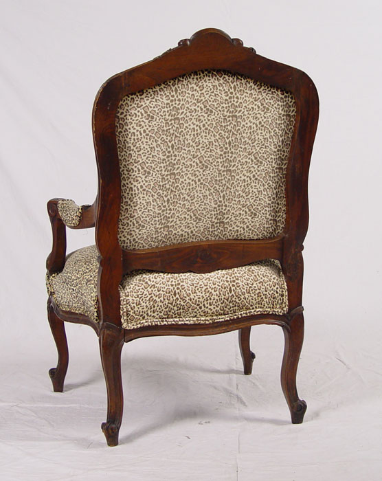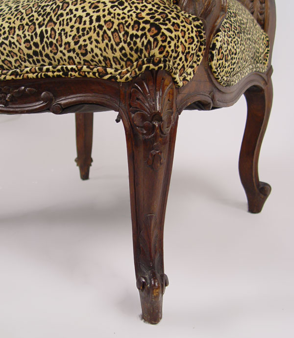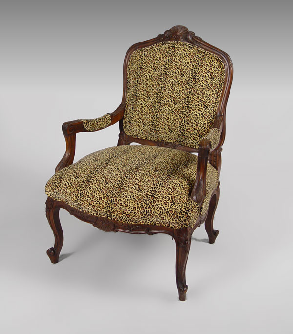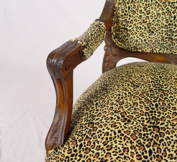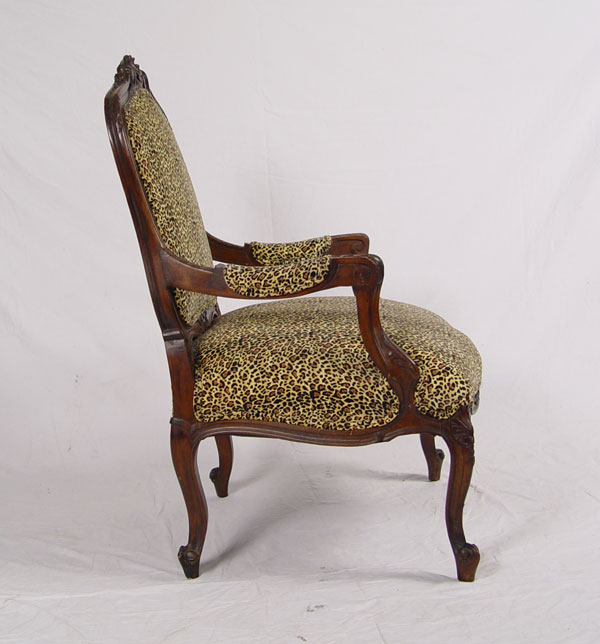 CARVED LOUIS XV STYLE FRENCH FAUTEUIL: Natural finish carved walnut with detailed carvings to the back crest, arms, apron and legs. Later leopard print upholstery. 39''h. x 28'' x 24''.