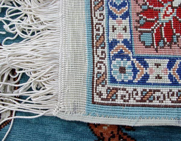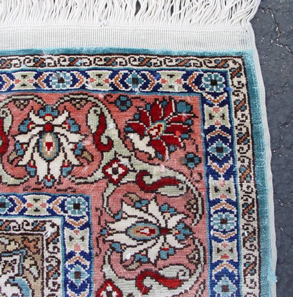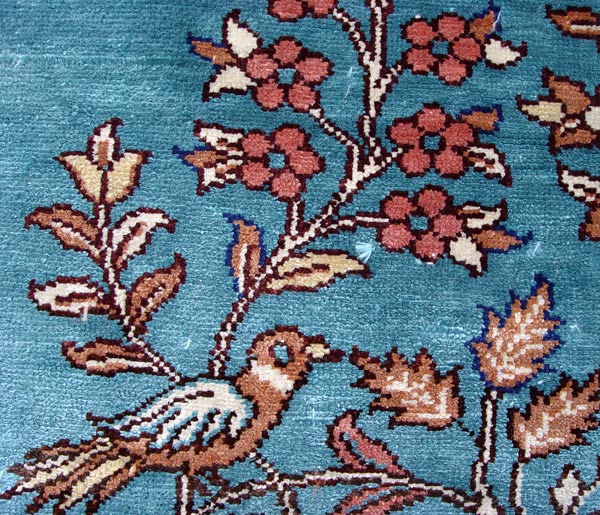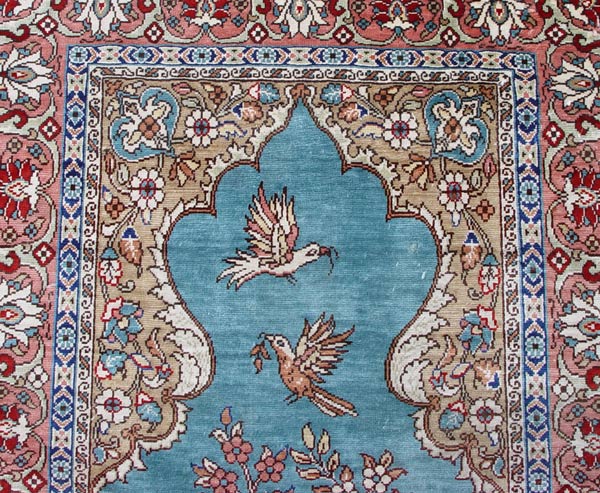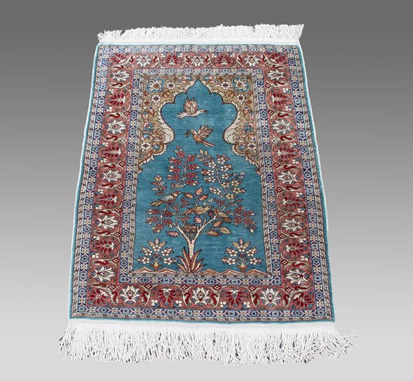 SILK KASHMIR PRAYER RUG: Central birds in tree motif, light blue ground. Approx. 28 1/4'' x 42''