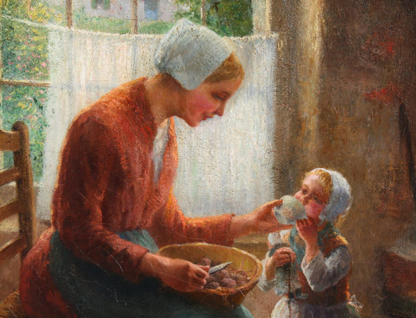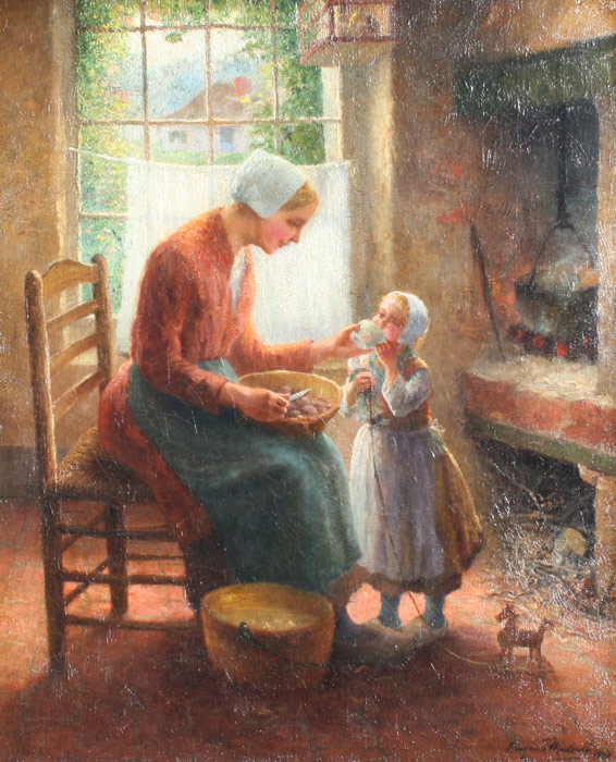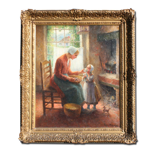 MULLERT, Eugene, (Dutch-American, 1869-1963): ''Mother & Child by a Sunlit Window'', Oil/Canvas, 29'' x 24'', signed and dated 1927 lower right, carved and gilded period frame with missing gesso from corners, 36'' x 32''.