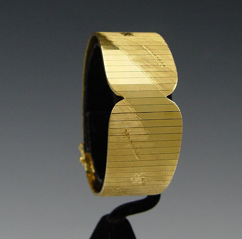 18K VINTAGE 1950'S GOLD BRACELET: 18K yellow gold bracelet with graduated segmented links. Floral engraving on front. Bracelet has been resized, cut out piece is included. Two figure eight safety clasps. Weight: 65.0 grams. Length: 6.5''