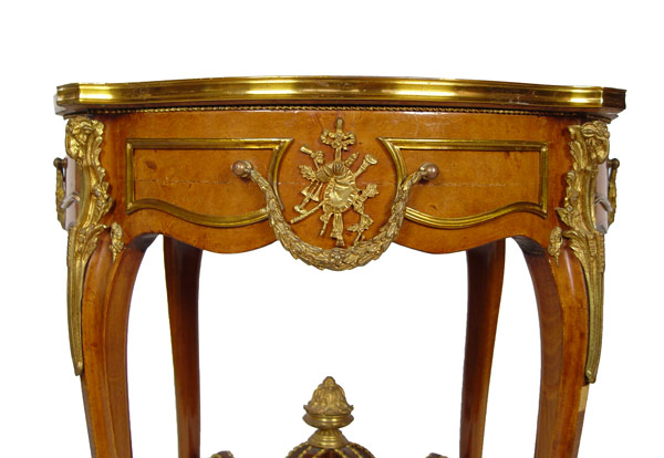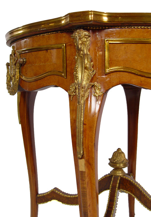 LATE VICTORIAN FRENCH STYLE MARBLE TOP TABLE: Green marble turtle top over burl veneer table frame. Over all gilt metal trim with swag and rams head ormolu. Central stretcher with twisted trim and gilded finial. 32'' x 28 3/4''.