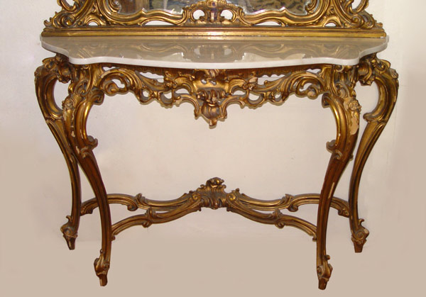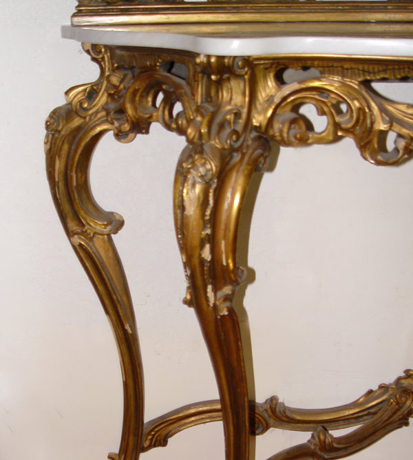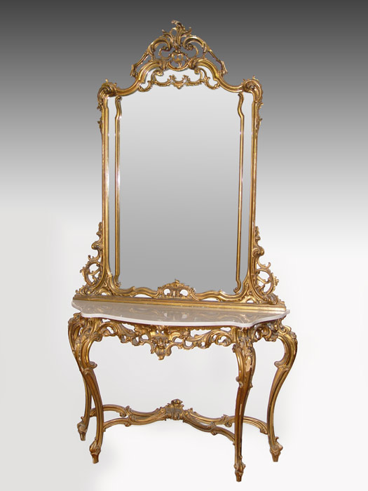 ROCOCO MARBLE TOP GILT HALL TABLE AND MIRROR: Heavy carved and open cut ''ocean wave design''. White marble top and long French leg with stretcher. Note: Some missing gesso and gilding. Mirror: 50 1/2'' wide, 4'' deep, 64'' tall, Table, 52 1/2'''' wide, 17'' deep, 37'' tall.