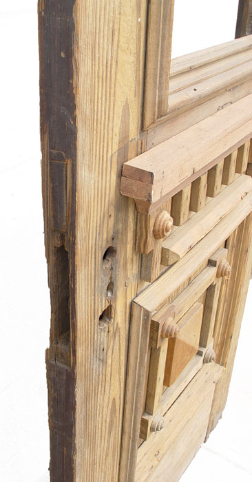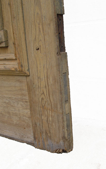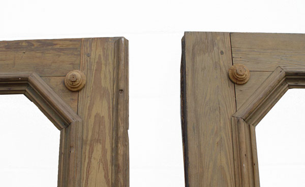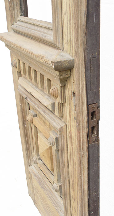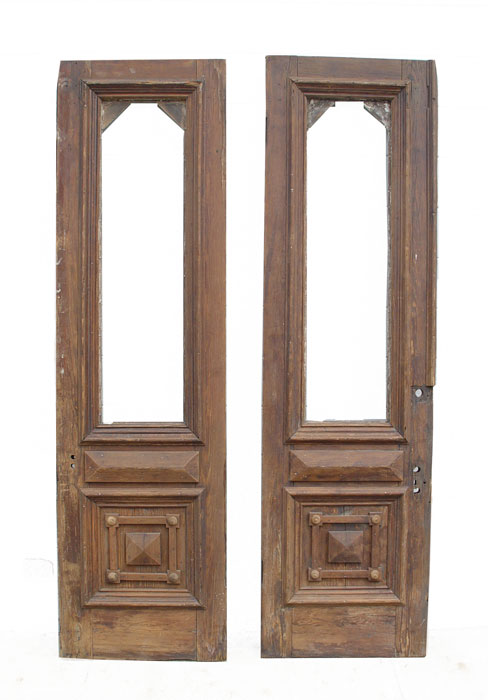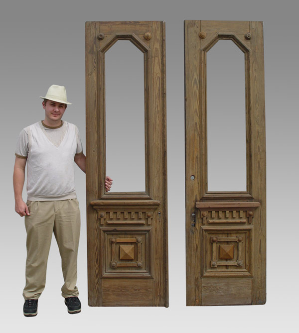 PAIR OF 8 FT TALL VICTORIAN ARCHITECTURAL ENTRANCE DOORS: Heavy red pine with single window light above dental molding, recessed panel with applied moldings. No hardware and in untouched condition. 27 ½'' wide, 5'' deep, 96'' tall (each).