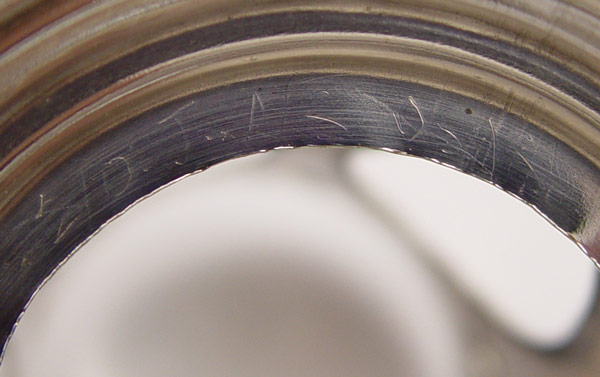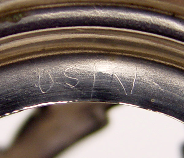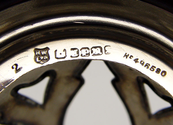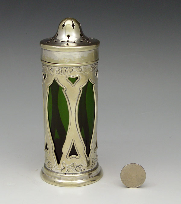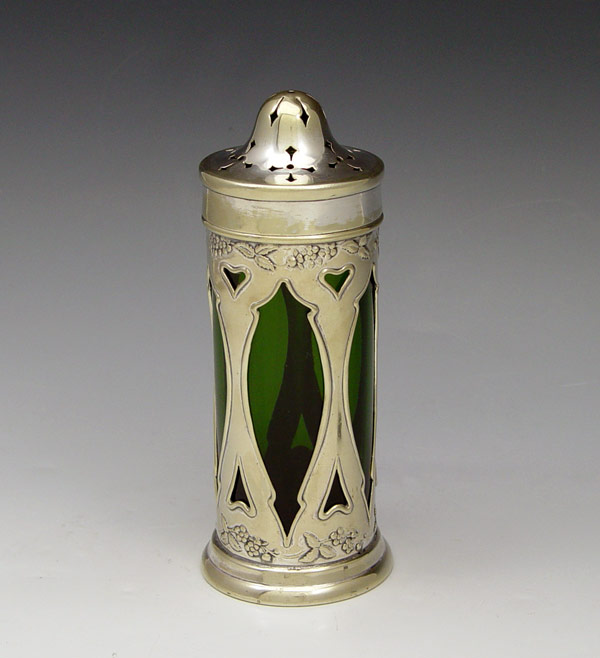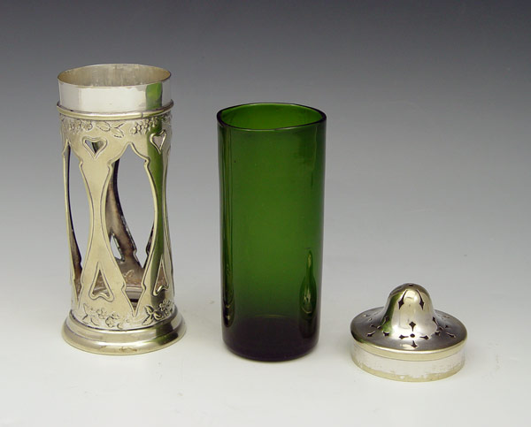 ENGLISH SILVERPLATE MOUNTED GREEN GLASS MUFFINEER: Art nouveau style with dark green interior glass. Unknown makers hallmarked HW LTd. in shield. 6 1/4'' h. x 2 1/2''.