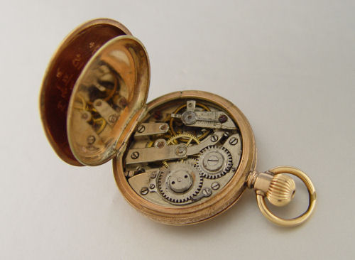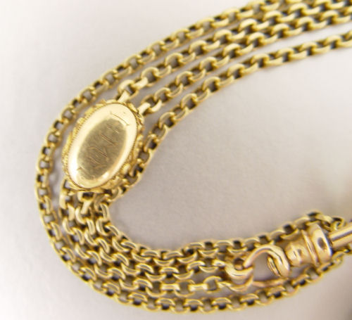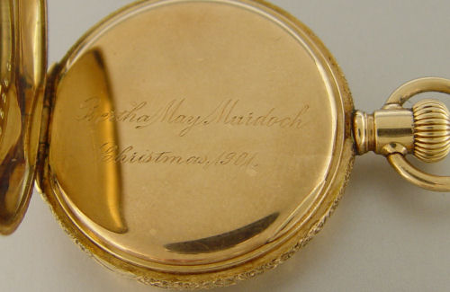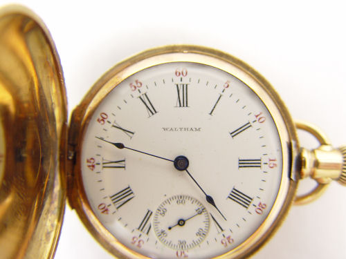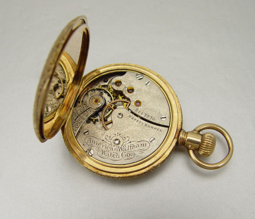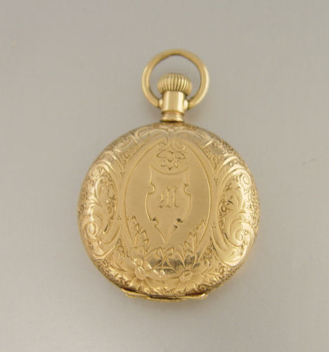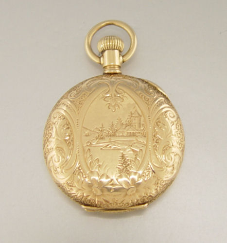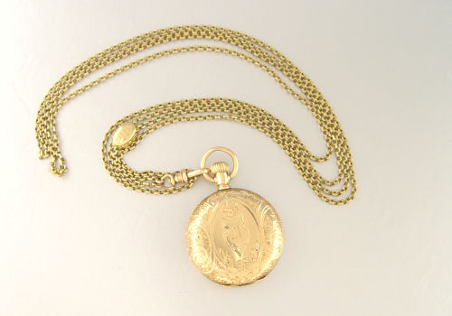 WALTHAM 14k GOLD POCKET WATCH: Size O, 15 jewels. Serial number 9,117,776 indicates ca. 1900. Victorian design etched case. Appears to all original. The 48'' chain assays 14K yellow gold. The slide and swivel are gold filled.