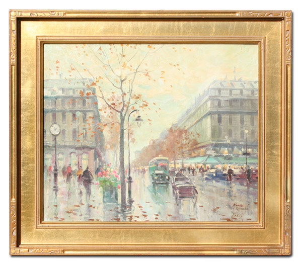 RENARD, Henry, (French, 20th C): Parisian Street Scene, Oil/Canvas, 20'' x 24'', signed, titled 'Paris' lower right, carved and gilded frame, 27'' x 30 1/2''.