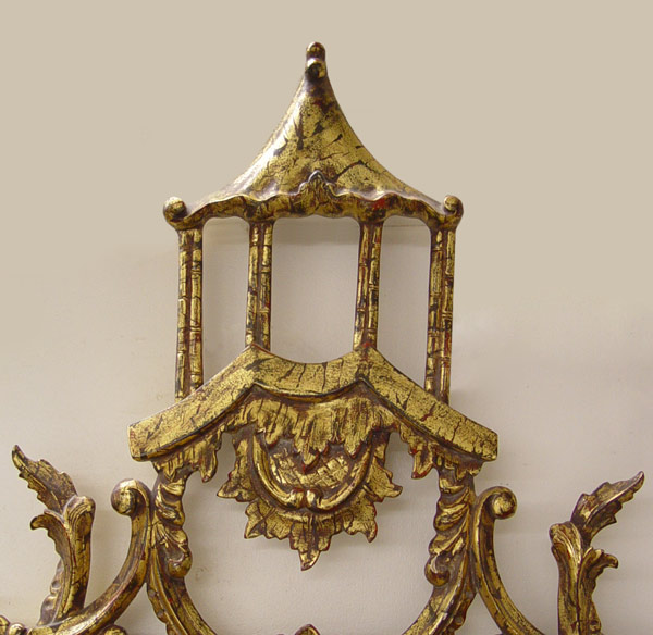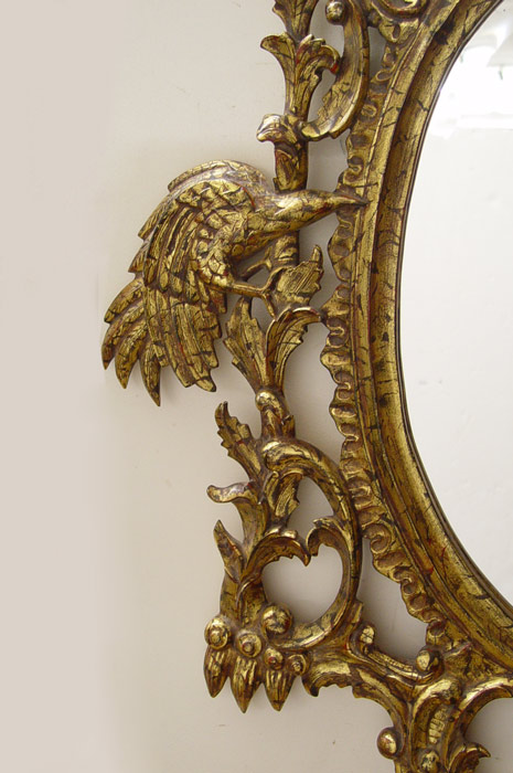 DECORATIVE CHINESE CHIPPENDALE STYLE GILT MIRROR: With pagoda crest, birds flank the beveled oval looking glass, 51'' x 34'' overall.