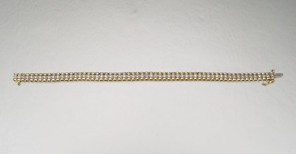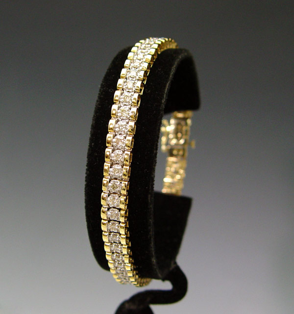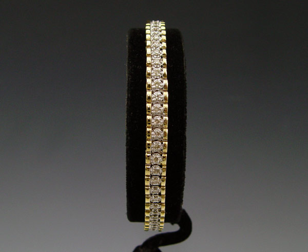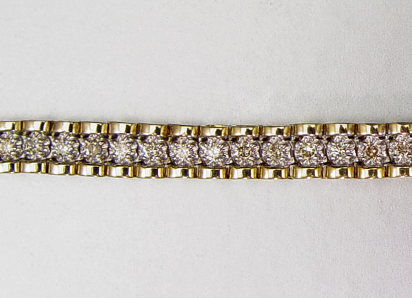 14K 2.00 CTW DIAMOND BRACELET: Sixty round brilliant cut diamonds, total a 2.00 Ct. Approx. The diamonds average SI in clarity and Tope Light Brown in color. The diamonds are prong set. Figure eight safety clasp. Weight: 14.7 grams. Length: 8''