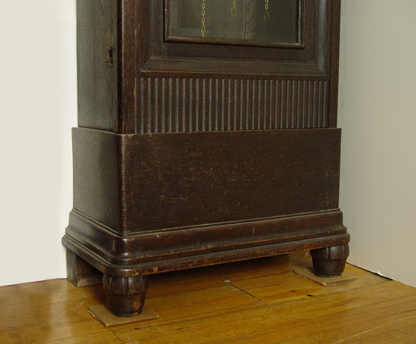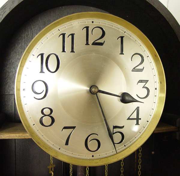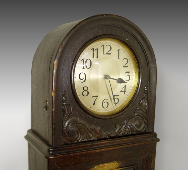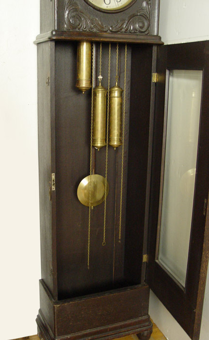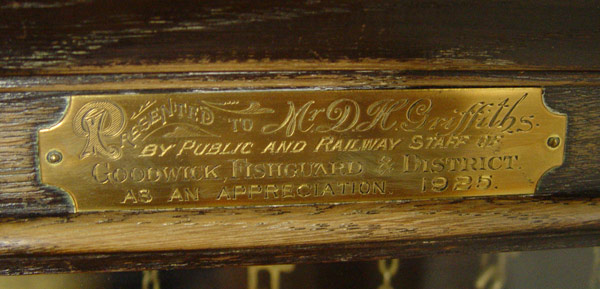 1920'S ENGLISH DECO CLOCK WITH RAILROAD PLAQUE DEDICATION: Dark walnut case with applied decoration. Brass plaque with dedication reads ''Presented to Mr. D. H. Griffiths by Public & Railway Staff, Goodwick, Fishguard & District, as an Appreciation 1925''. 3 weight and pendulum mechanism. Metal face with Arabic numerals, beveled glass on base. Replacement door key in office. Measures 80'' h. x 20 1/2'' x 10 1/2''.