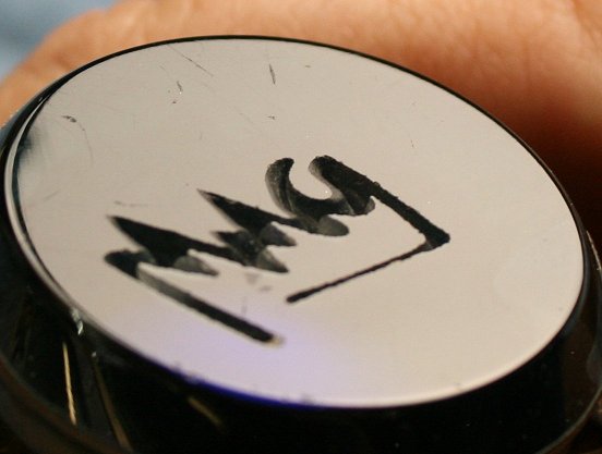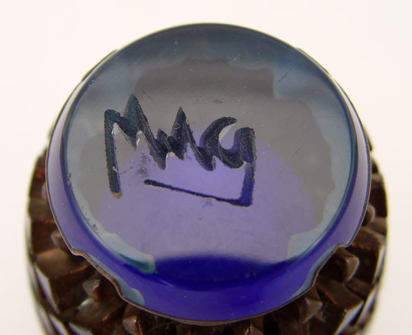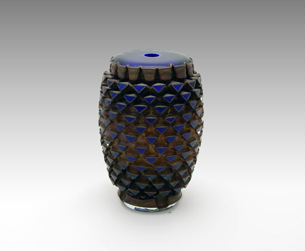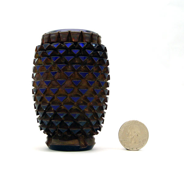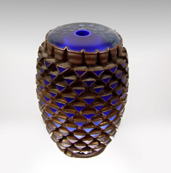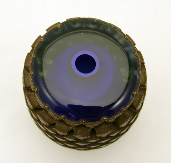 GLANCY, Michael, (American, 1950-): ''Beans Lapis Heater'', Important Blue Glass Vase with Electro-formed Copper overlay, 3 3/4'' h., incised signature to base. Titled . Provenance: Purchased from Heller Galleries for $1500, 1985.