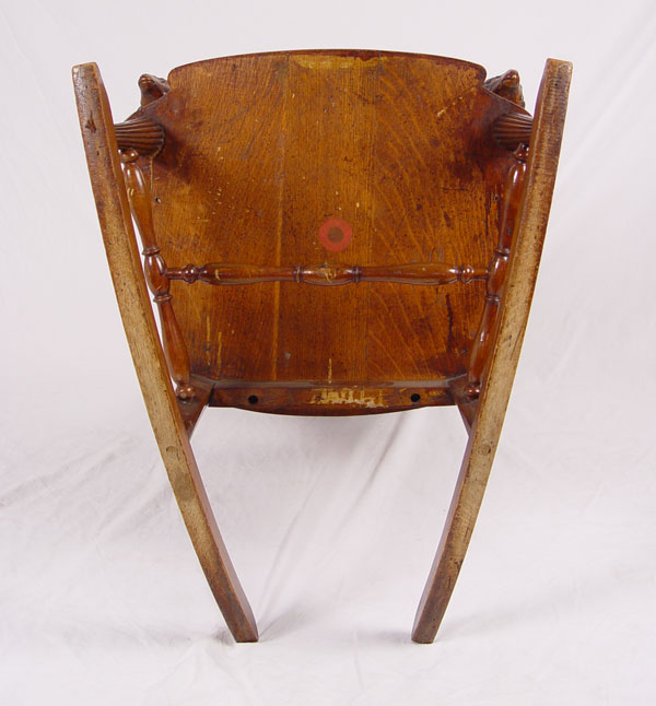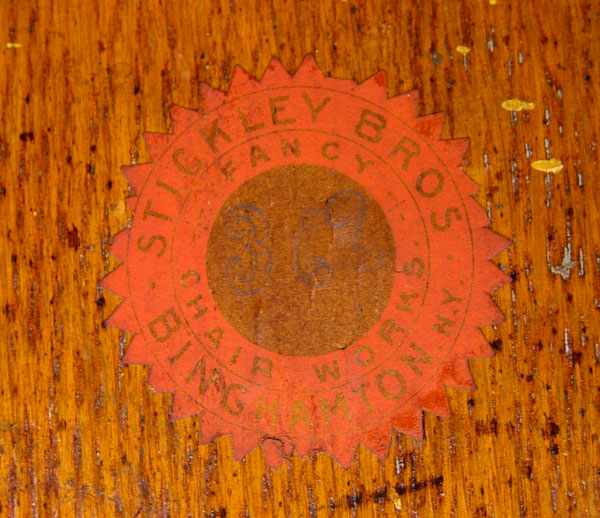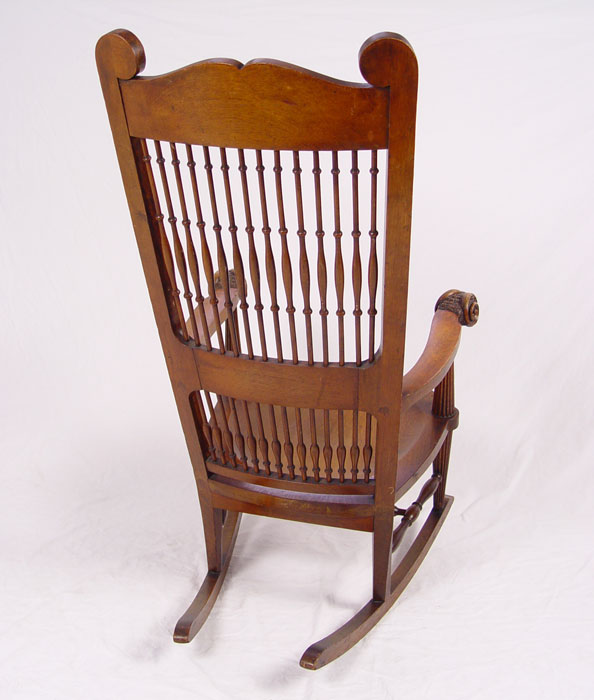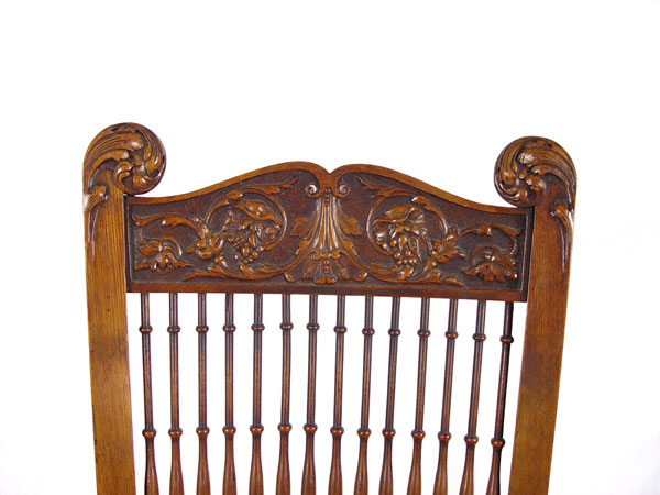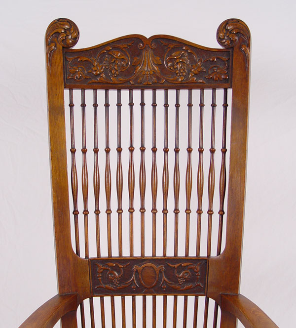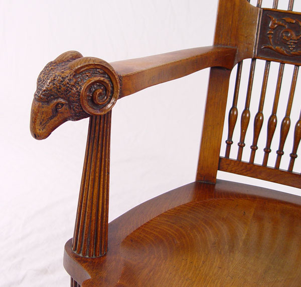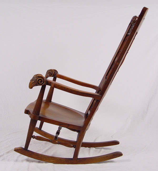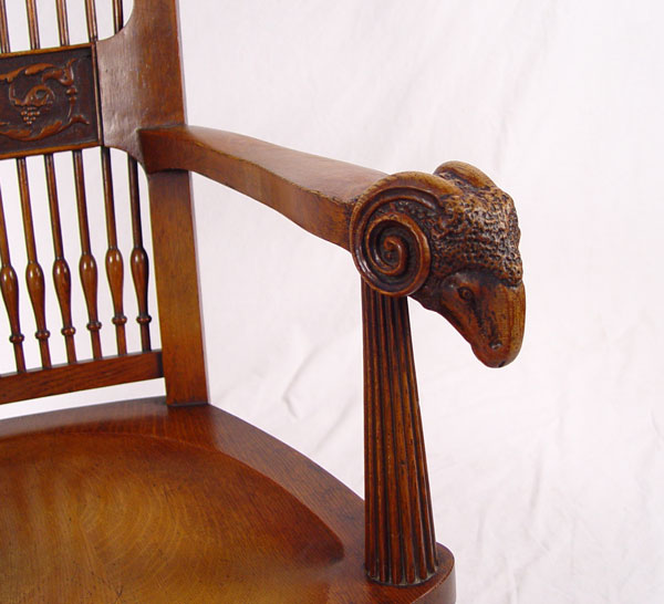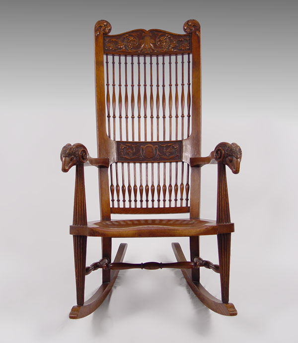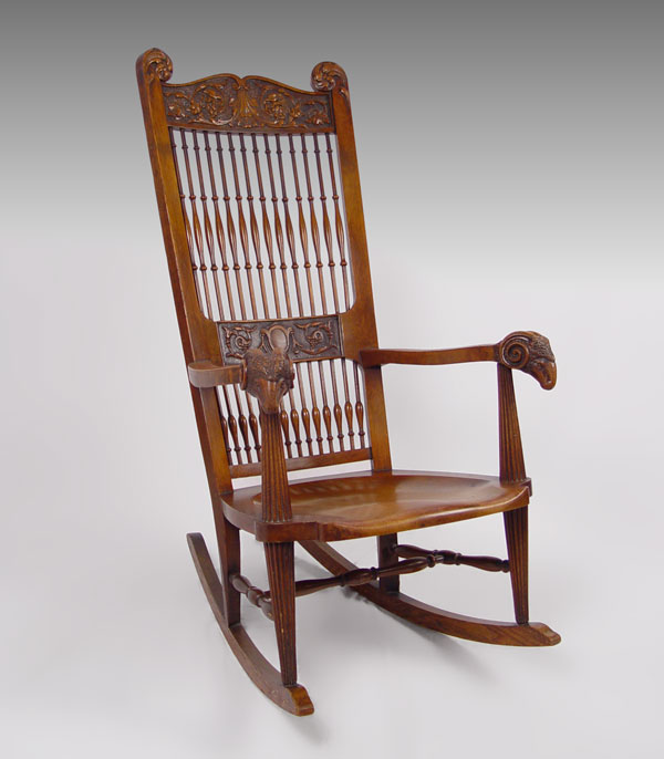 STICKLEY BRANDT RAMS HEAD FANCY OAK ROCKER CA. 1891-1918: Fine ornately carved rams head hand hold, spindle back, carved top rail. Charles Stickley, one of the Stickley brothers and cousin Schuyler formed the Stickley & Brandt Chair Co. in 1891. Label under seat.