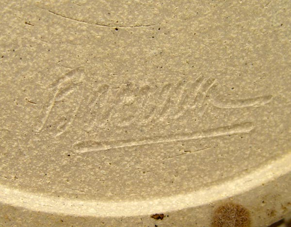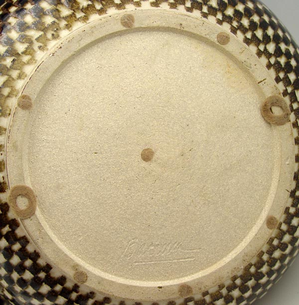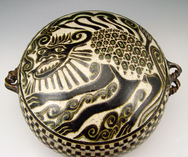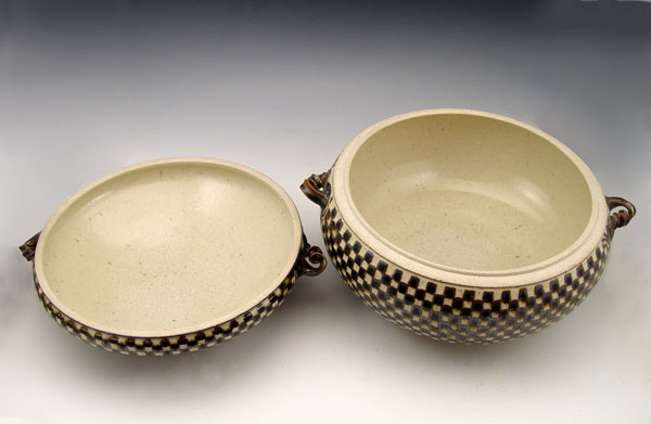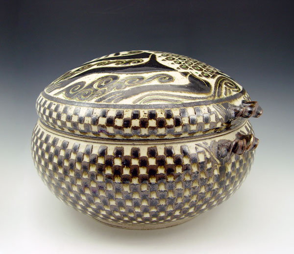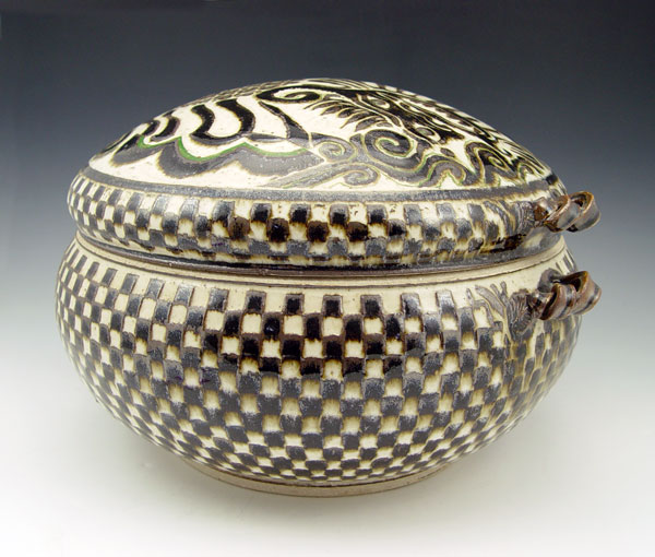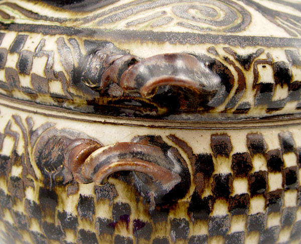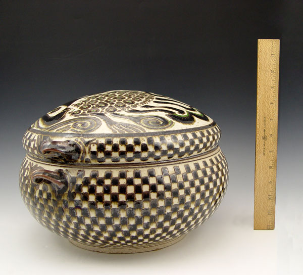BACERRA, Ralph, (American, 1938-): Covered Vessel c. 1981, 8'' h., 13'' dia., lidded & handled tureen, brown & white decorated sides, incised signature to base. Garth Clark Gallery 1991 appraisal for $6500.00 included. Est. $4000/6000**