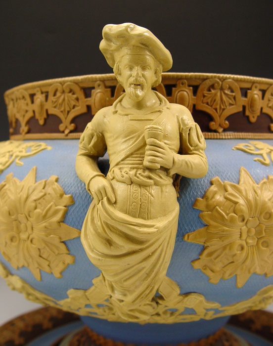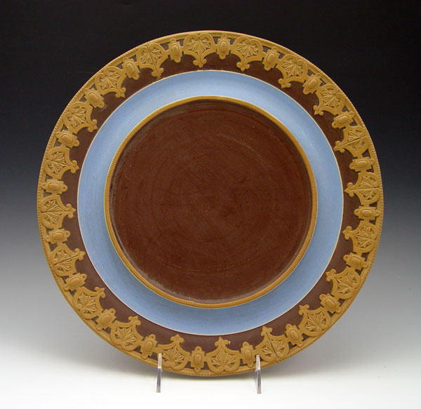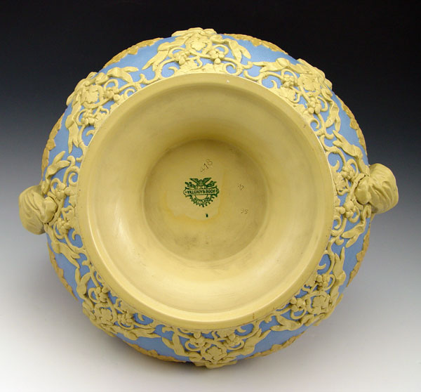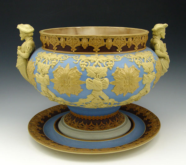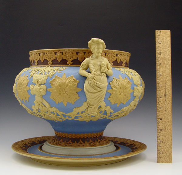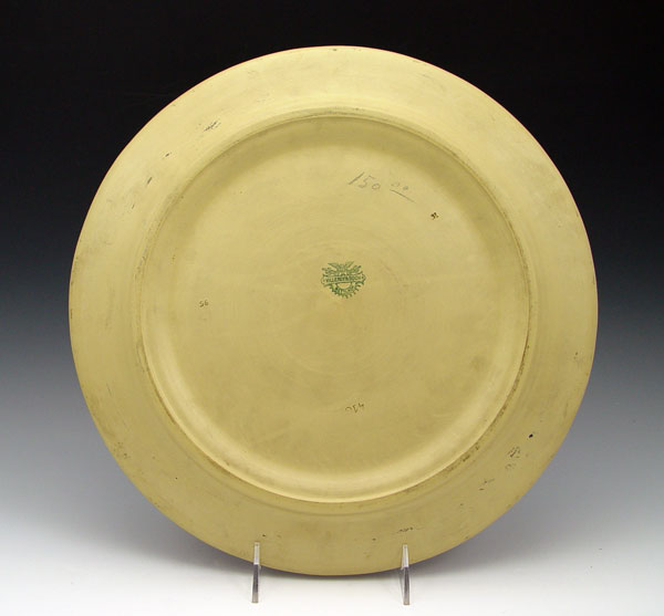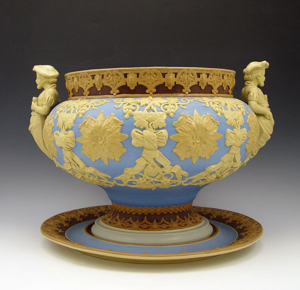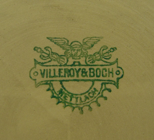 METTLACH SOUP TUREEN & UNDERPLATE #418: Stoneware tureen with applied figural handles. Garland, vine & grape leaf and medallion design. Marked Villeroy & Bach, Mettlach with incised 418. Tureen measures 10 1/4'' h. x 15'' overall dia. Underplate 13 1/2''