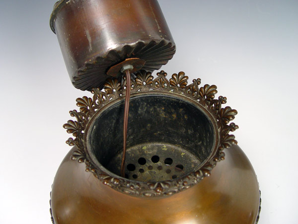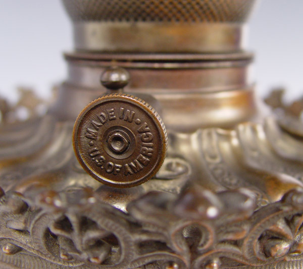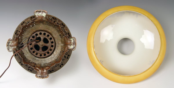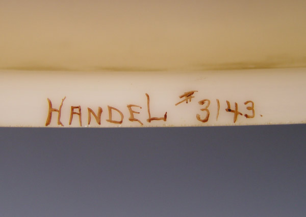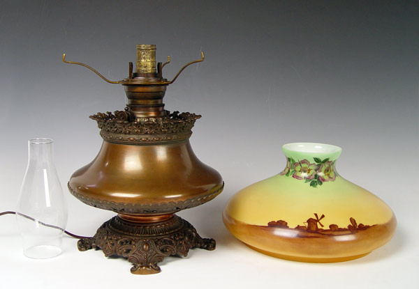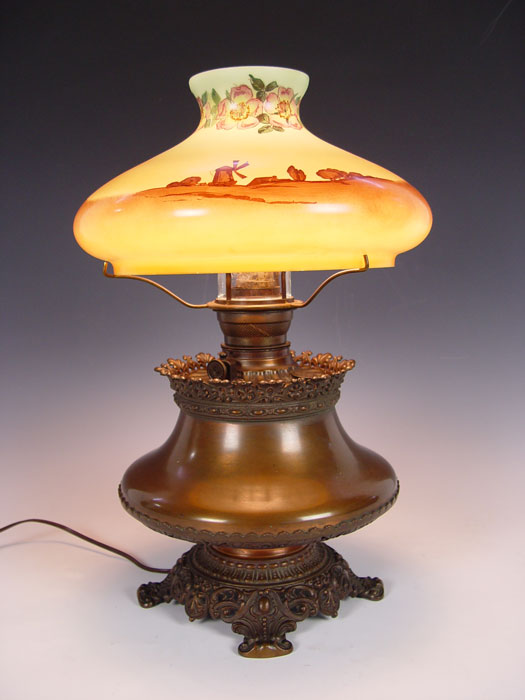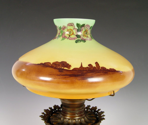 SIGNED HANDEL REVERSE PAINTED BRASS OIL LAMP: Converted oil lamp, shade signed Handel 3143, 12''dia., 19''h. overall.