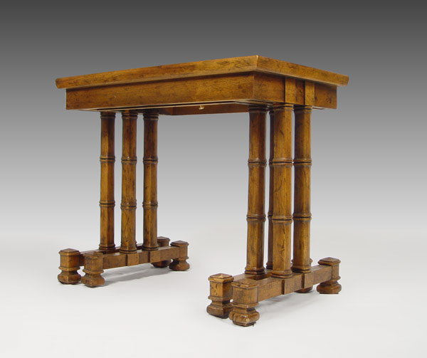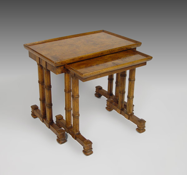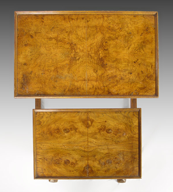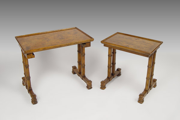 PAIR OF STACK BURL VENEER TABLES: 'T' stretcher and faux bamboo leg design. Molded tray top in butterfly veneer burl. 22'' h x 28'' x 16''.