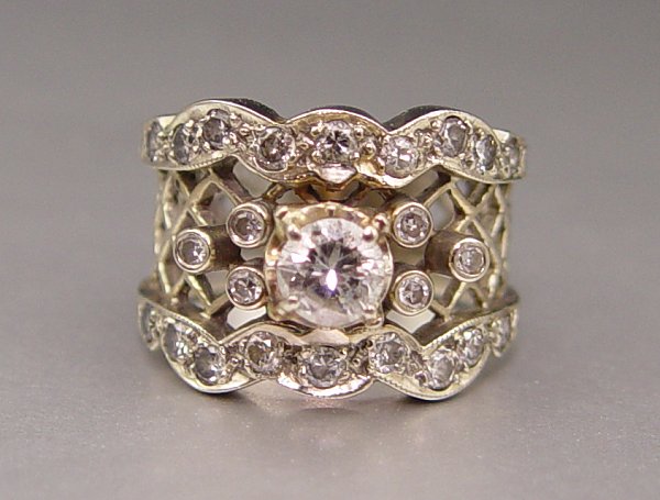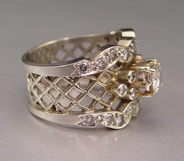 1 CTW DIAMOND LATTICE RING: 14K white and yellow gold ring contains twenty five round brilliant cut and round single cut diamonds. The center is an approx. .40 Ct. The diamonds average VS in clarity and H-I in color. The diamonds are prong set. Weight: 5.1 grams. Size: 6