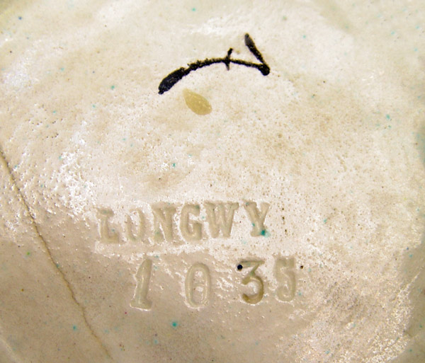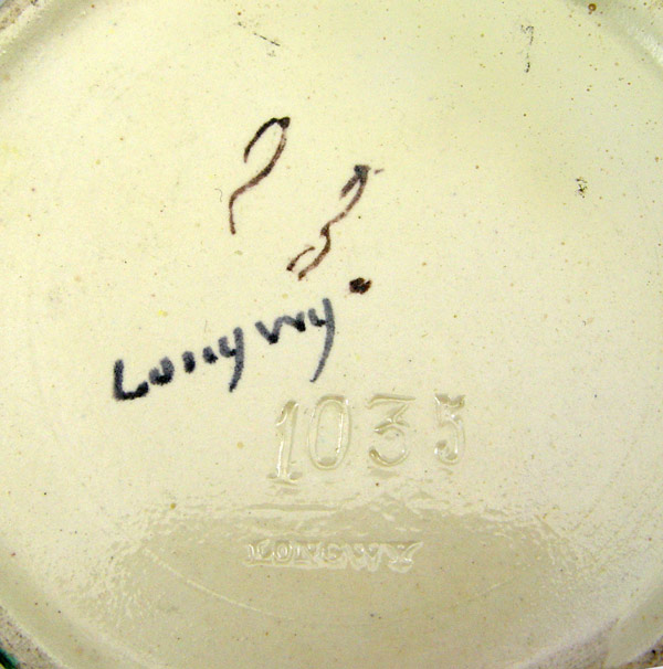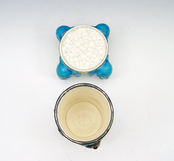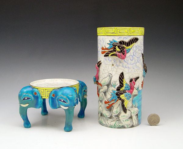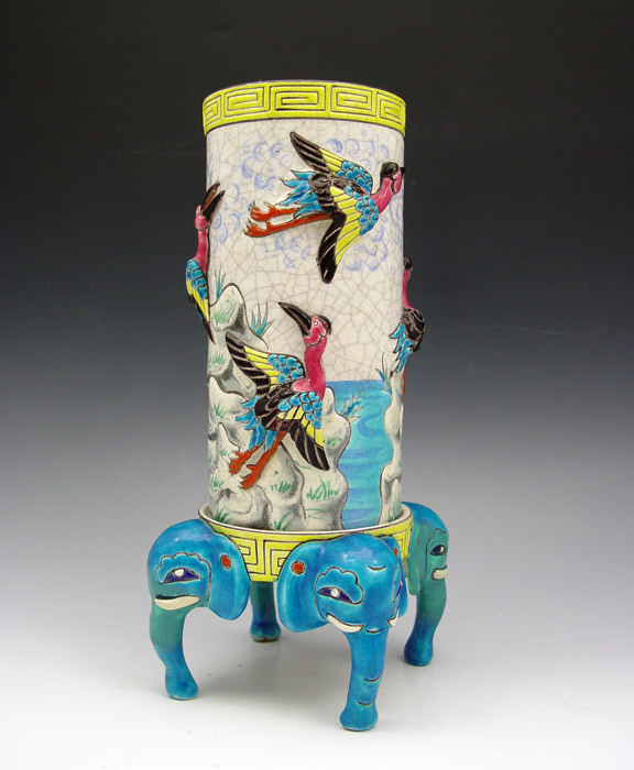 LONGWY FRENCH FAIENCE VASE ON STAND: Oriental motif with raised crane design on cylindrical vase, elephant form base. 10 1/2'' h. overall.
