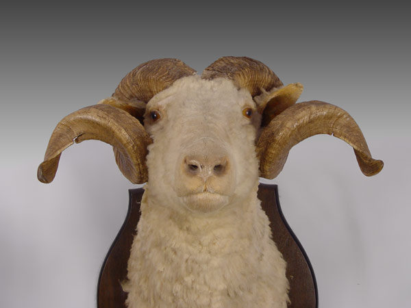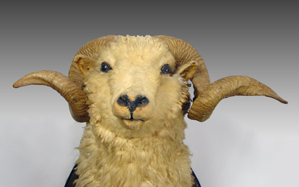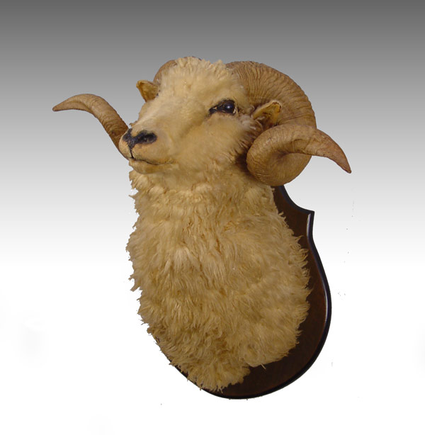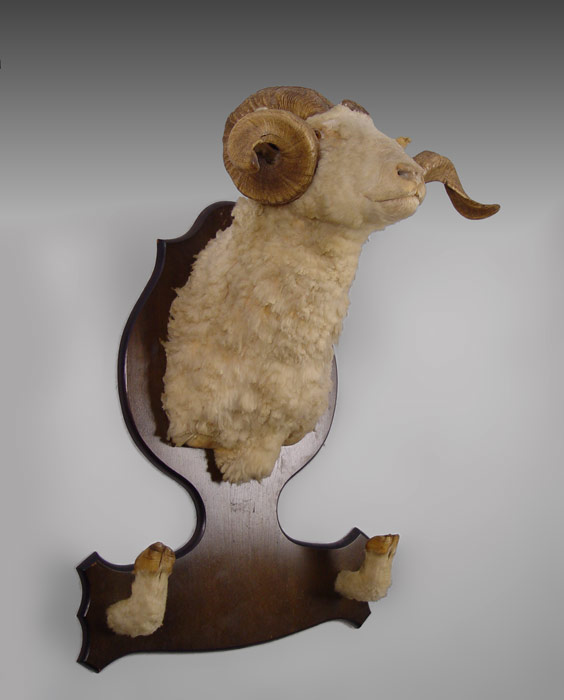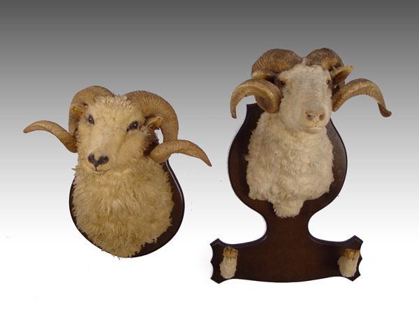 2 PIECE TAXIDERMY RAM HEAD MOUNTS: Larger has hoof gun mounts as well. Larger of 2 measures 37'' h. x 21 1/4'' x 19 1/2''.