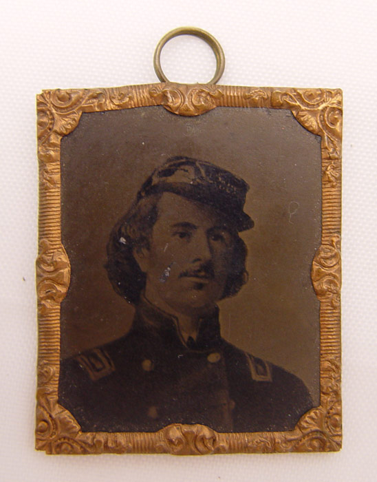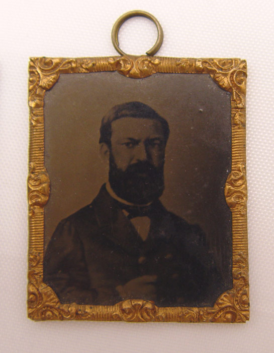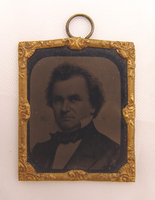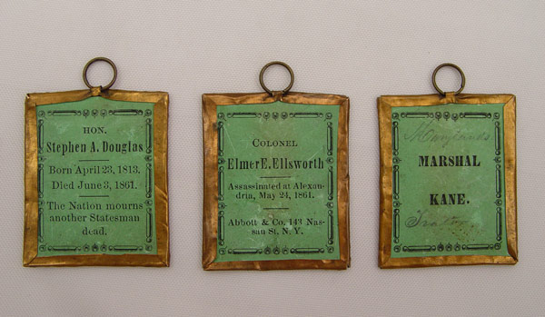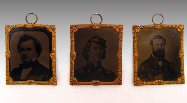 COLLECTION OF 3 CIVIL WAR MINIATURE TINTYPES: Each measures 1 3/8'' x 1 5/8''. Includes Col. Elmer Ellsworth, Marshal Kane, Stephan Douglas. Each has brass wrap frame and hanging ring.