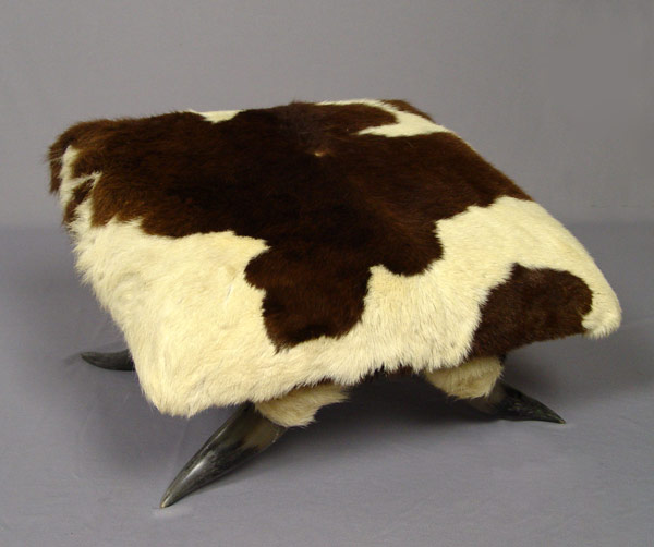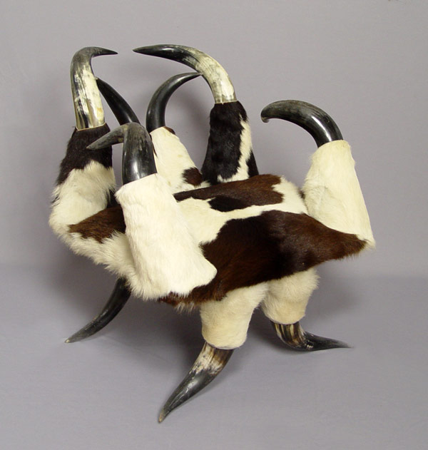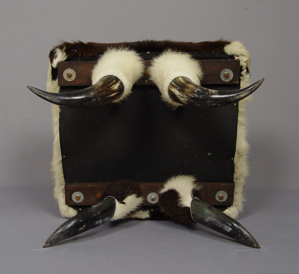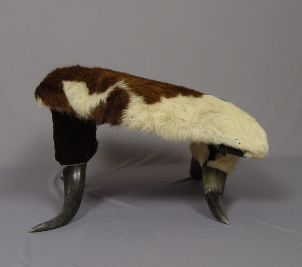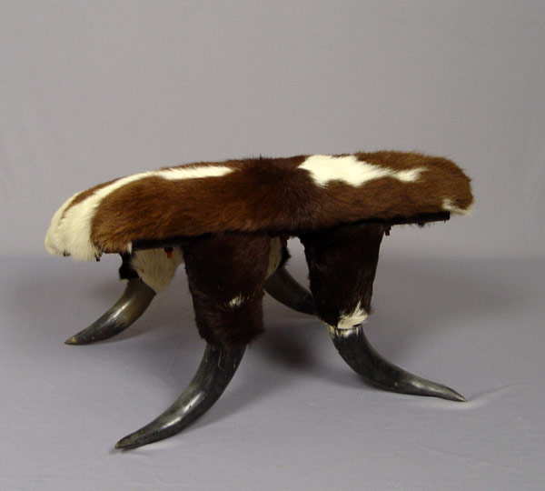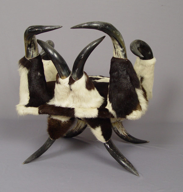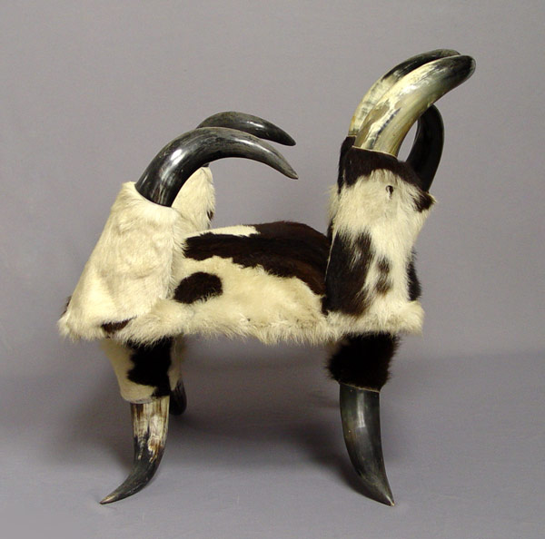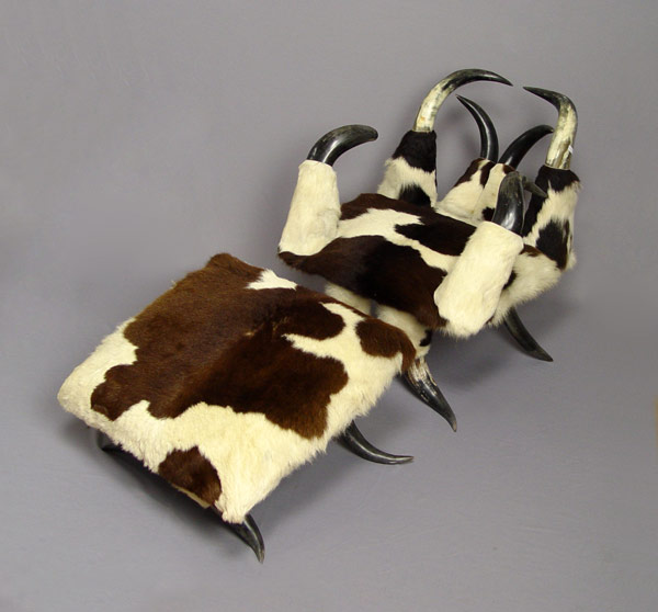COW HORN CHAIR & STOOL: Ten horn chair and four horn stool upholstered in ''hair on'' tri color cowhide, chair back approx. 27 1/2''h., stool approx. 14''h. and each approx. 24'' x 23''.