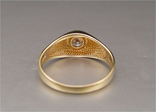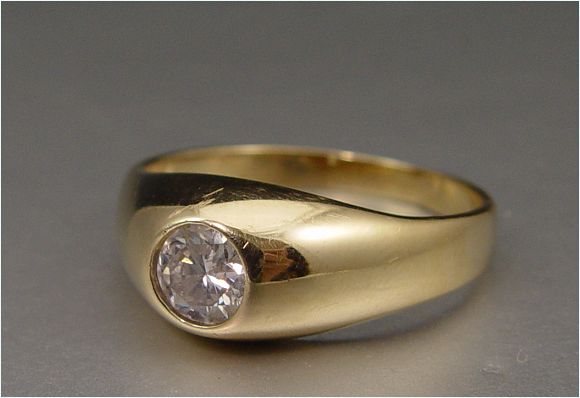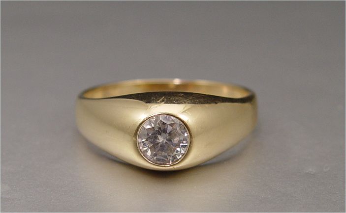 MAN'S 14K DIAMOND SOLITAIRE RING: 14K yellow gold ring contains one round brilliant cut diamond. Weight: .70 Ct. Approx. Rated SI2 in clarity and J in color. The diamond is gypsy set. Weight: 5.2 grams. Size: 11