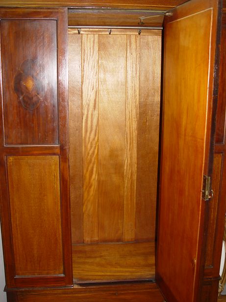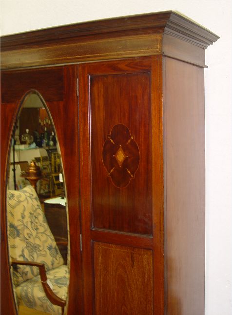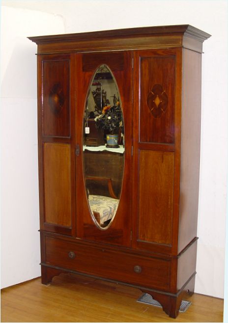 MAHOGANY VICTORIAN ARMOIR: Double paneled front with decorative veneer inlay. Central door with long oval mirror. Single lower drawer at base. Interior fitted with bar and hooks. 79'' h. x 51'' x 20''.