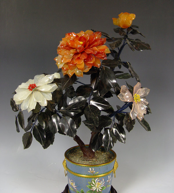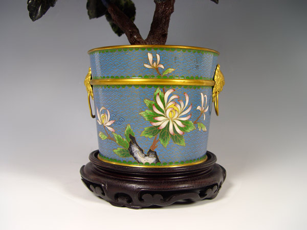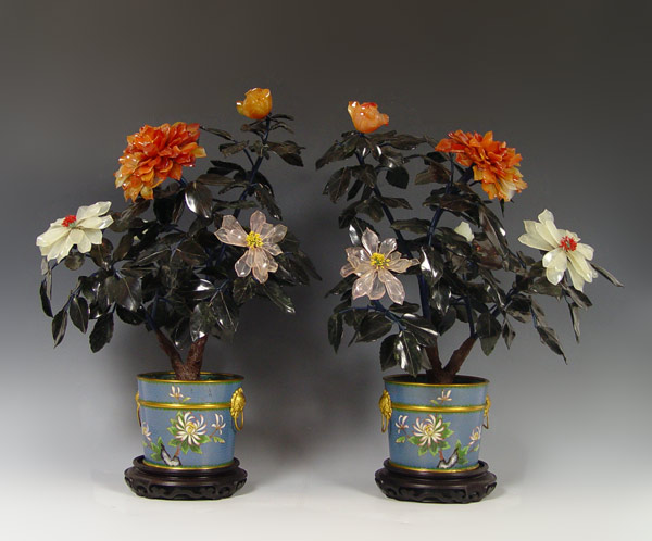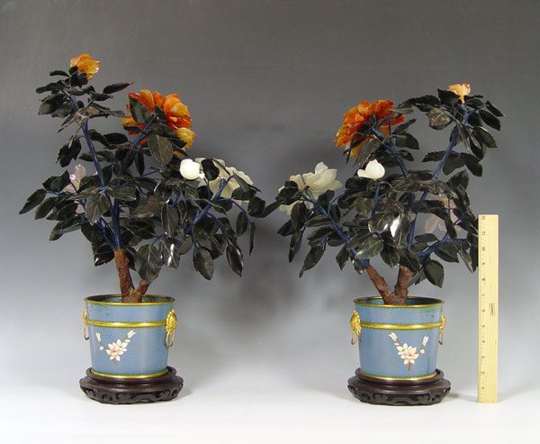 TWO LARGE CHINESE STONE TREES IN CLOISONNE JARDINIERE: Semi precious carved stone trees, 21'' tall.