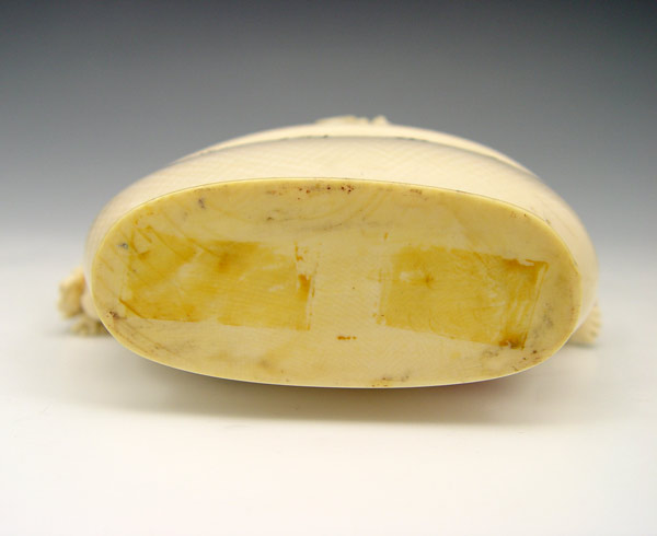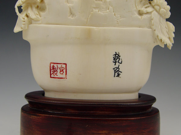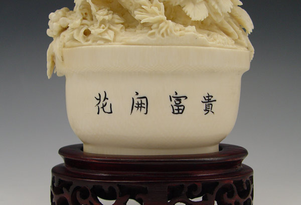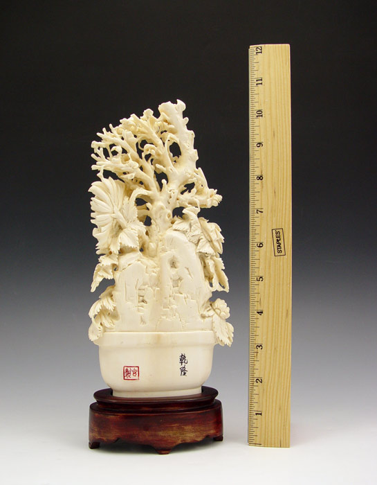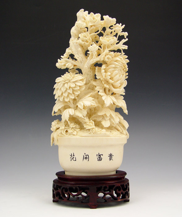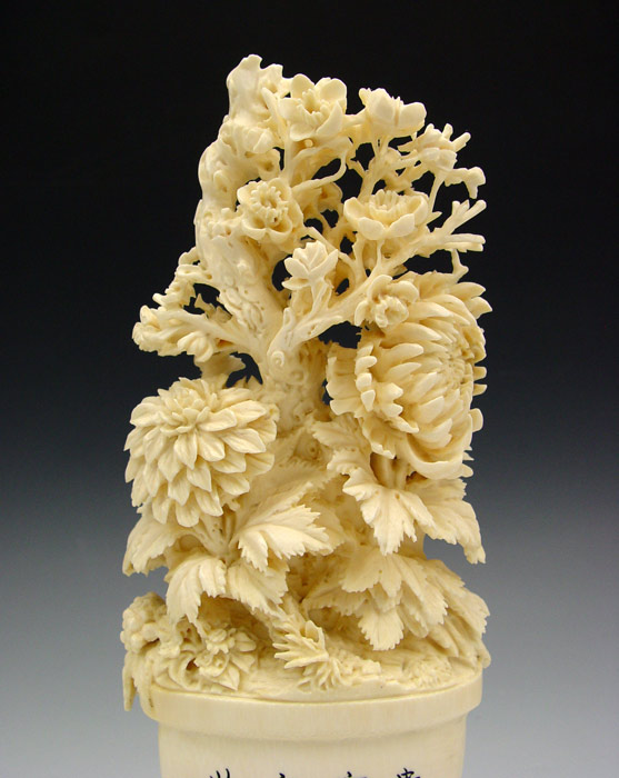 CARVED IVORY CHRYSANTHEMUM IN POT: Signed. 8 1/2'' tall x 4'' wide x 1 1/2''.