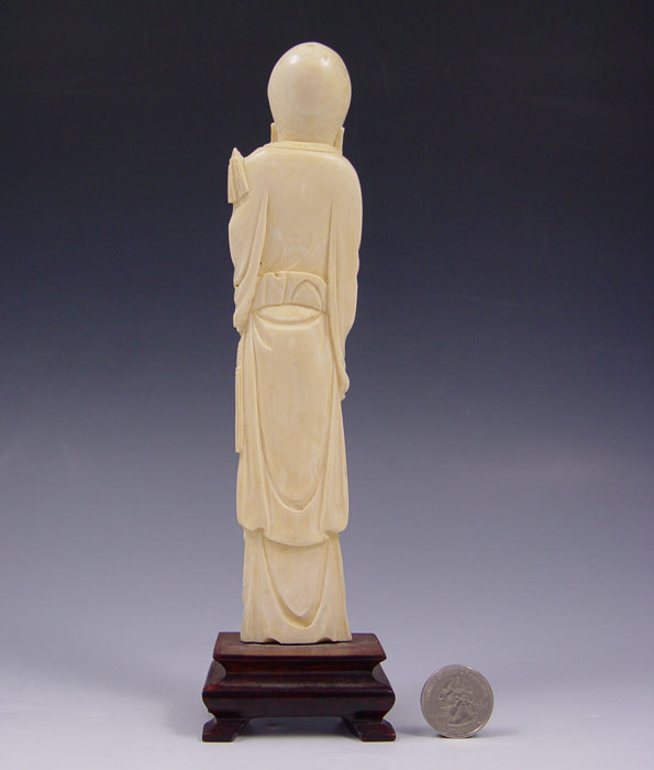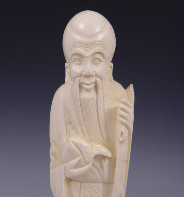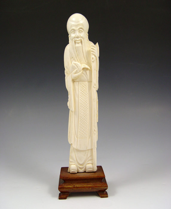 CARVED IVORY FIGURE OF AN ELDER: Man holding staff and lotus fruit. Figure measures 8 1/4'' h., 9 1/4'' h. on stand.