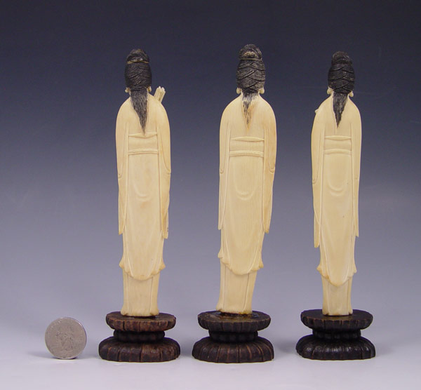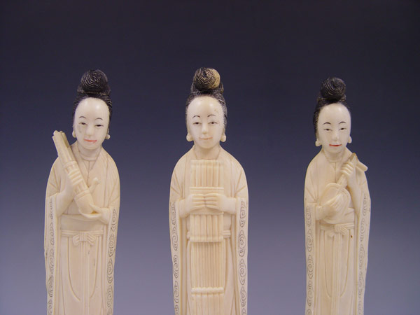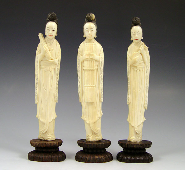 3 CHINESE CARVED IVORY FEMALE MUSICIAN FIGURES: Set of 3, each holding a different instrument. Measures 6 1/8'' h., 7 1/4'' h. overall affixed to wood stand.