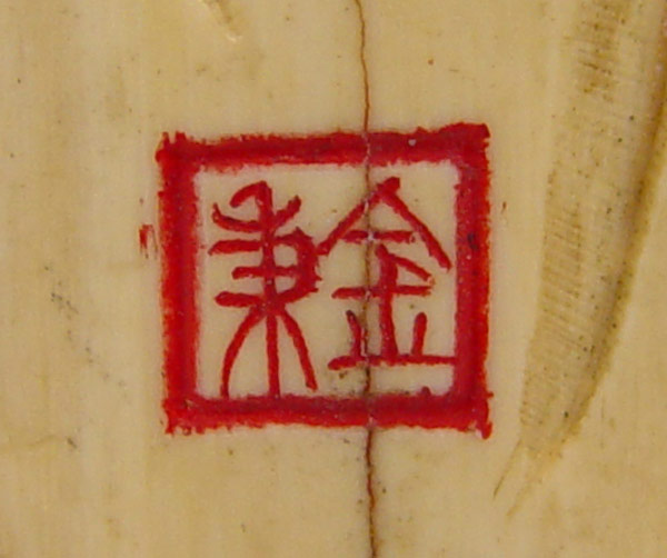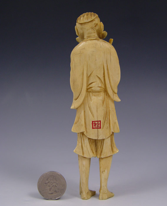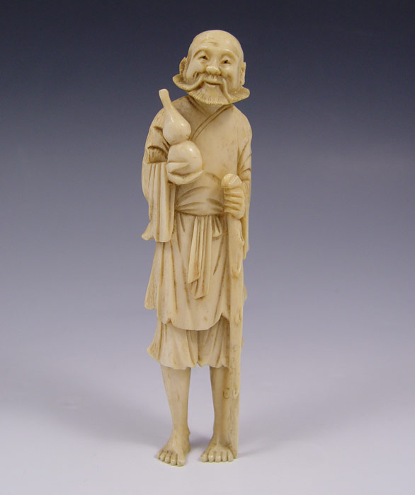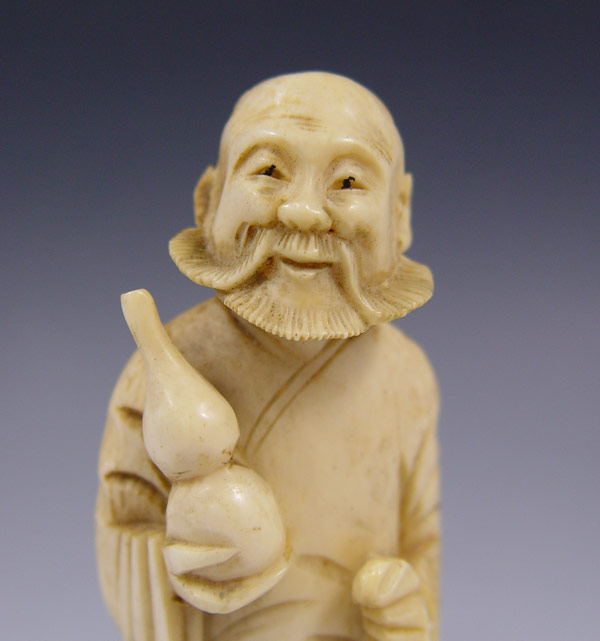 SIGNED CARVED IVORY FIGURE: Figure holding gourd and staff, signed on back. 6 1/8'' h.