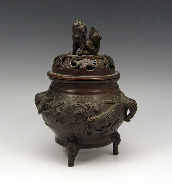 BRONZE CENSOR: Tripod censor with a bird and flower design, patinated brass, West Capital mark in characters. 8'' tall, 6 1/4'' wide.