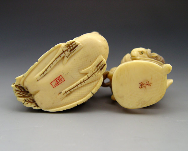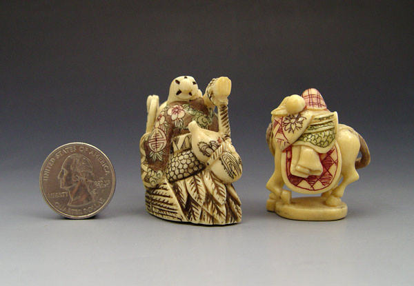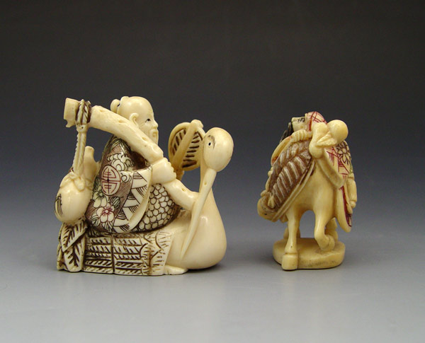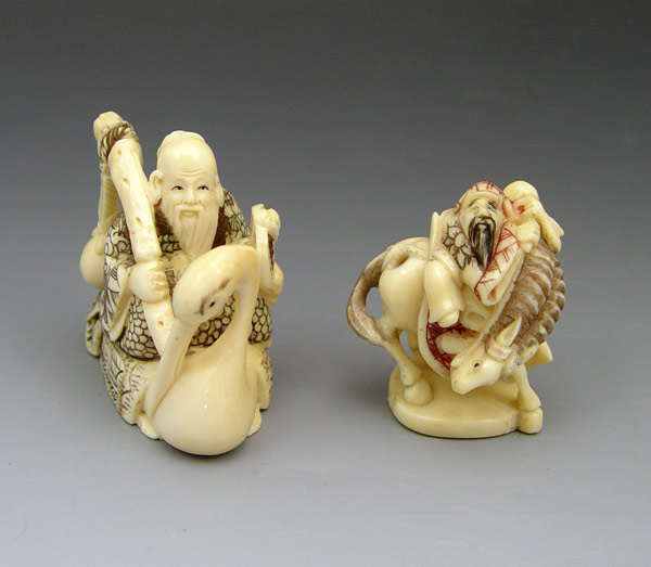 2 PIECE CARVED IVORY NETSUKE: To include 1) Man on horse, signed on base in characters. 1 5/8'' h. 2) Man riding swan or crane, signed in characters on base. 1 3/4'' h.