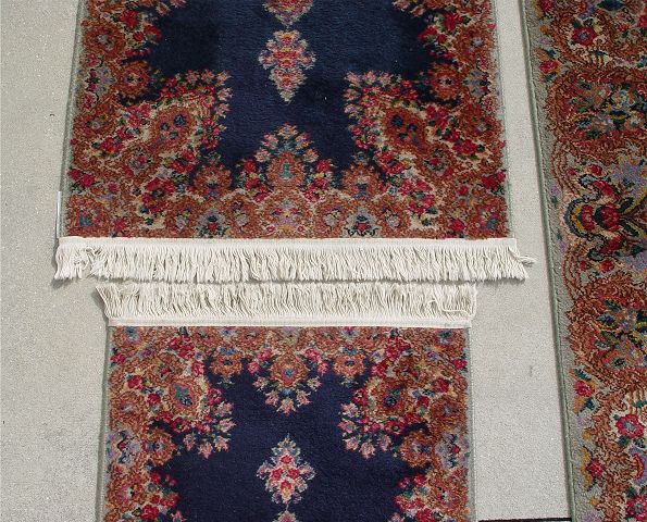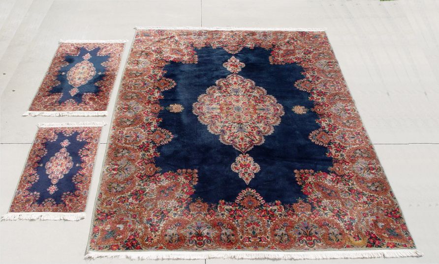 3 DARK BLUE KARISTAN KIRMAN DESIGN CARPETS: 12'3 1/2'' x 8'6''; 5' x 2'10''; 3'10'' x 2'2''