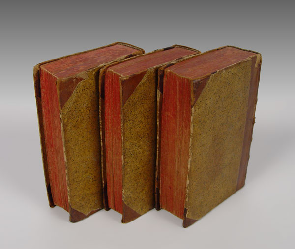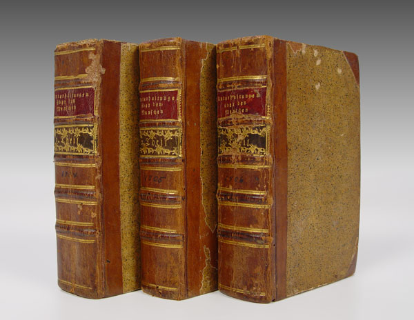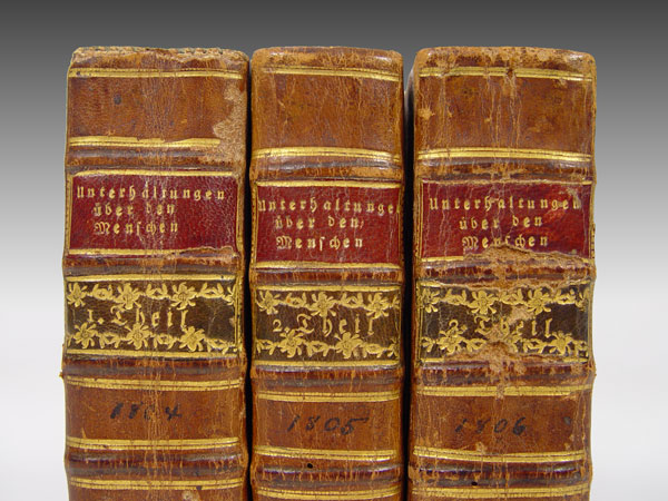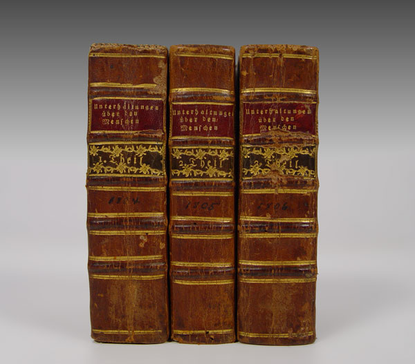 WILHEM, Gottlieb Tobias, (German 1758-1811): Unterhaltengen Uber Den Menschen, Augsburg: Martin Engelbrechtschen, 1804-1806. 3 volumes. Small quarto (18 cm), half calf & boards, xii, 516 pp., LXII leaves of plates + [vii], 488 pp., LIX leaves of plates + [xxii] pp., LXXII leaves of plates. Engraved titles and a total of 193 handcolored copper-engraved plates of human biology and world cultures. Very Good condition