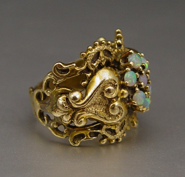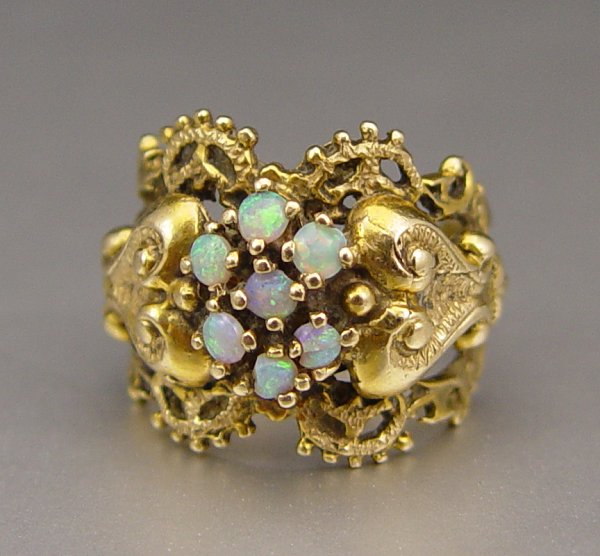 FILIGREE 14K OPAL RING: Ornate 14K yellow gold ring contains seven round cabochon cut crystal opals. Weight: .30 Ct. Approx. Blue/Green play-of-color. Two opals are chipped or broken. The opals are prong set. Weight: 8.6 grams. Size: 6