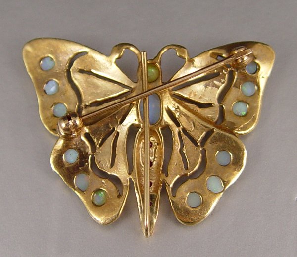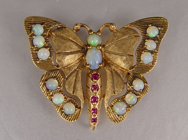 14K OPAL & RUBY BUTTERFLY BROOCH / WATCH LAPEL PIN: 14K yellow gold brooch contains thirteen round cabochon cut and one oval cabochon cut crystal opals. Weight: 1.00 Ct. Approx. Blue/Green play-of-color. Five round mixed cut rubies. Weight: .18 Ct. Approx. The opals and rubies are prong set. Bar pin closure and pendant/watch hook. Weight: 8.8 grams.