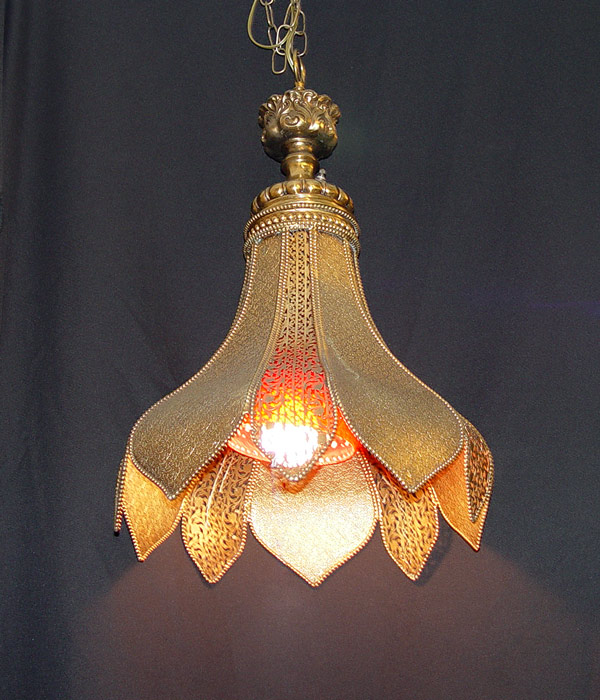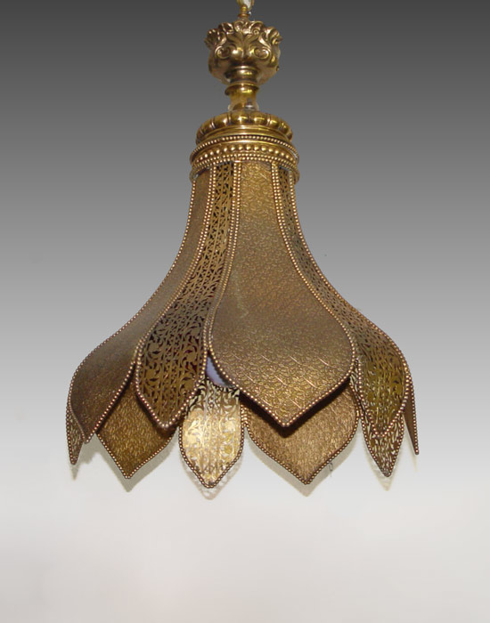 PIERCED BRASS HANGING LIGHT MOSQUE LAMP: Central single light with red glass shade visible through the pierced brass. Approx. 23'' tall, excluding the chain, 24'' wide.