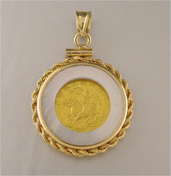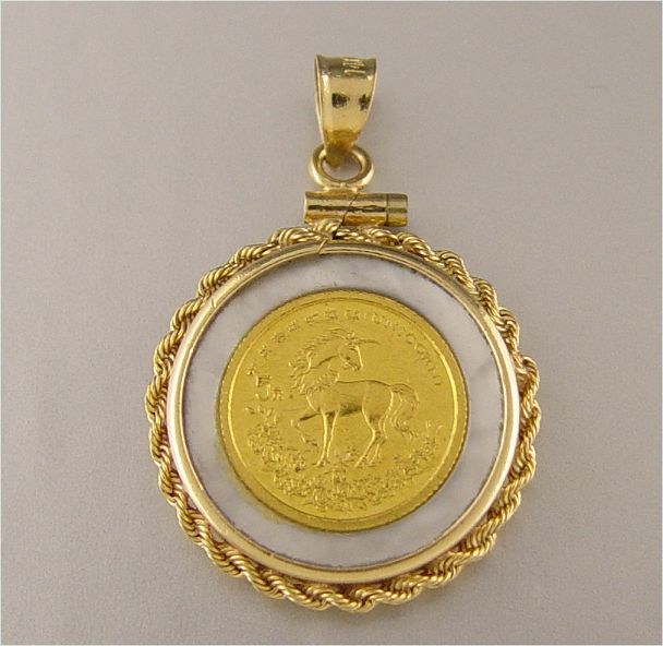 14K COIN FRAME 5 YUAN UNICORN COIN: 14K yellow gold rope coin frame with mother-of-pearl insert. 5 yuan 1/20 unicorn coin. Frame Weight: 3.2 grams approx.