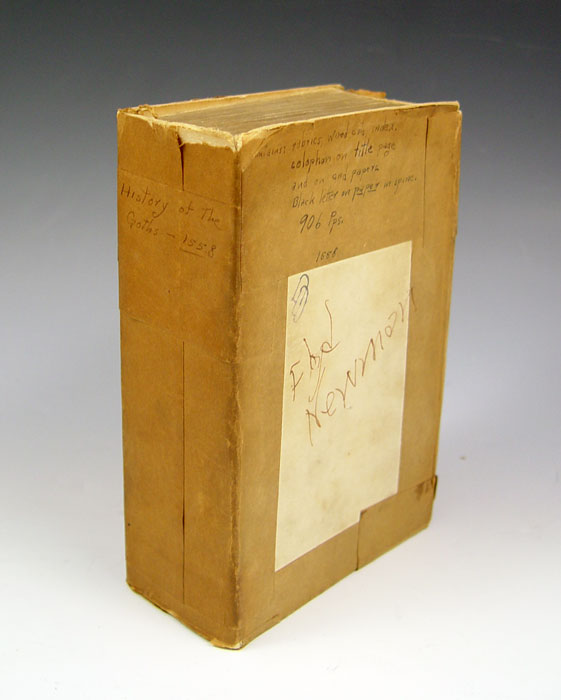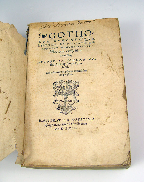 GOTHUS, Johannes, (Swedish, 1643-1664): 16th Century History of Scandinavia. GOTHORUM SUEINUMQUE HISTORIA, EX PROBATIS ANTIQUORVM MONUMENTIS COLLECTA, & IN XXXIIII. LIBROS REDACTA by Archbishop of Uppsala Johannes Magnus Gothus. Basel: Ex officinal Isingriniana, 1558. Octavo, lacks covers, [xvi], 907, [ci] pp. Woodcut map of Scandinavia, woodcut illustrations, decorative initials. An early illustrated history of Sweden, Norway, Finland and Denmark.