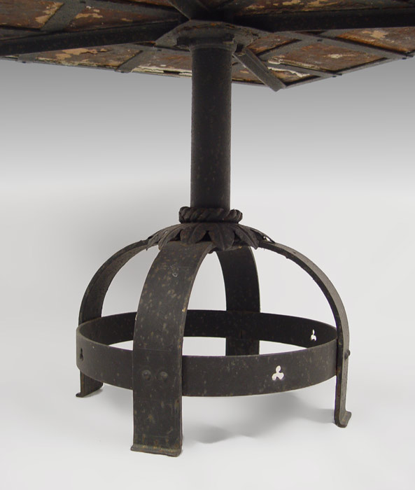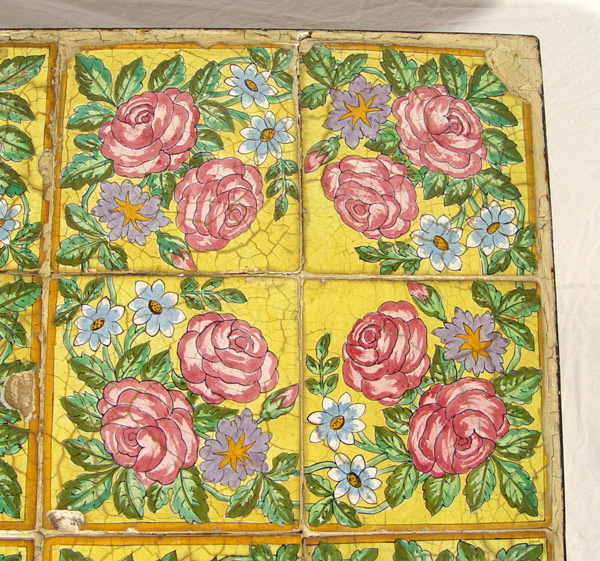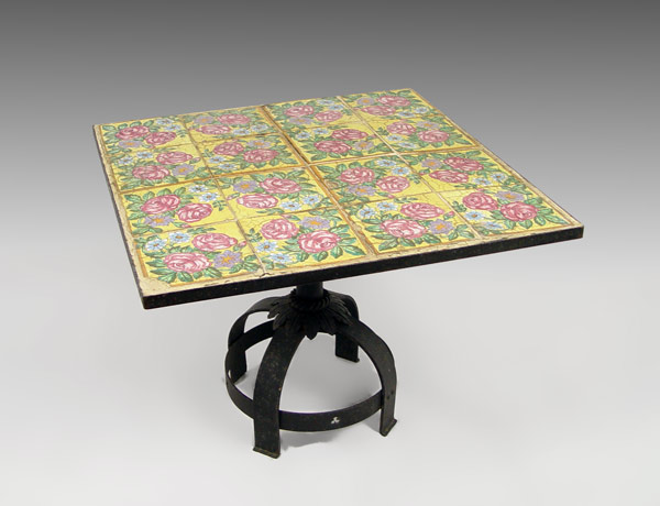 19th C ITALIAN TILE-TOP TABLE W/ IRON BASE: 16 matching floral tiles with yellow ground set in iron frame. Central iron base with fixed iron ''bird cage'' style leg. 24 1/2'' h x 32 1/2'' x 32 1/2''.