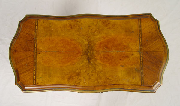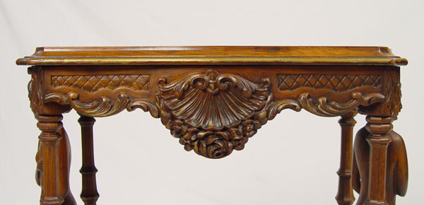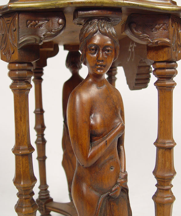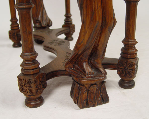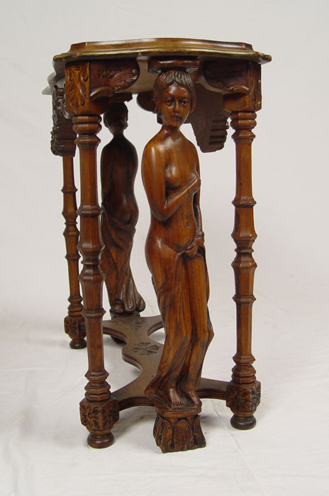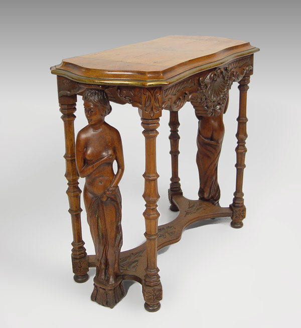 VICTORIAN CUSTOM CARVED BURL VENEER OCCASIONAL TABLE: Butterfly burl veneer with inlay decoration. Grecian women figural carved supports, shell carved apron and stretcher. 24'' tall x 26'' wide x 24'' tall.