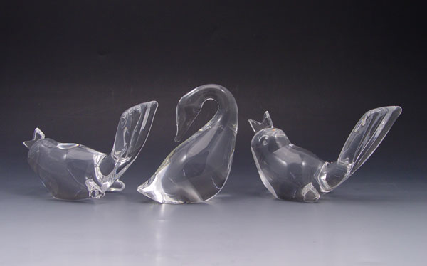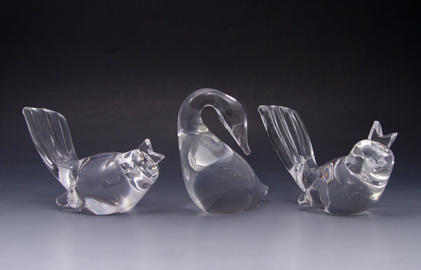 3 STEUBEN CRYSTAL BIRDS: All three are signed. Swan is 4'' tall, the two birds are 3'' tall.
