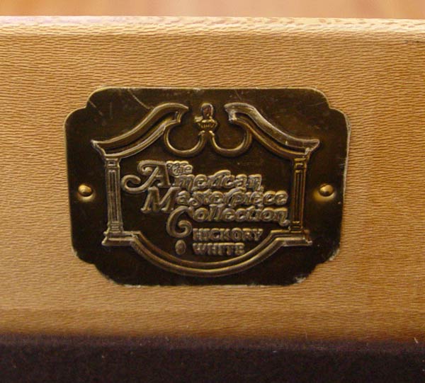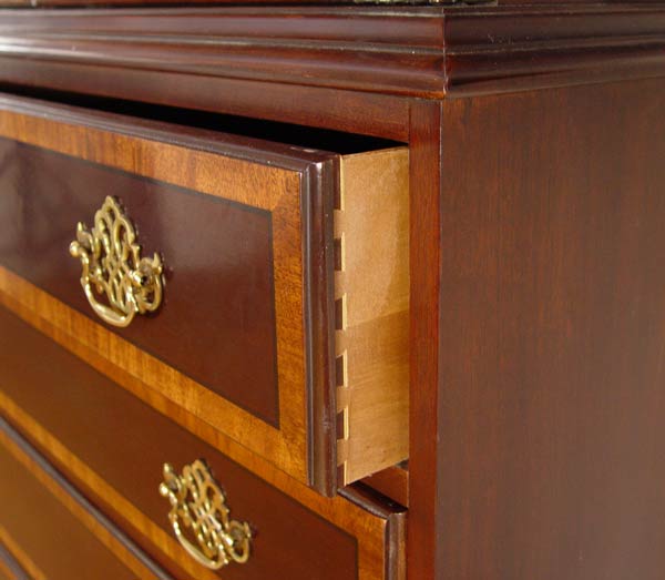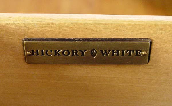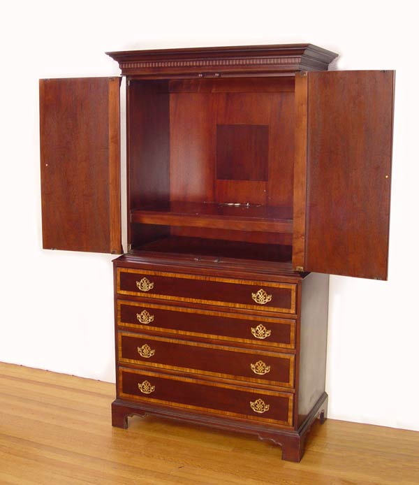 HICKORY WHITE BLINDFRONT ENTERTAINMENT CABINET: Top with dentil molding. Polished veneer with band inlay, double doors with fitted lid interior for electronics. Chest with 4 graduated band inlay drawers with cut Chippendale style pulls. On cut bracket base. 78'' h. x 40'' x 22 1/2''