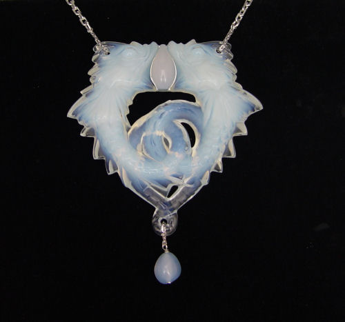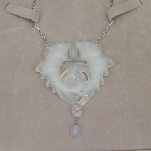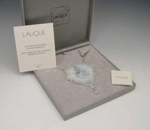 LALIQUE DEUX PASSIONS CRYSTAL SAUTOIR PENDANT NECKLACE: Limited edition opal glass two fish Lalique pendant with sterling chain. Made in France. New condition, in the original presentation box. The crystal pendant alone is 4'' l, 3.25'' wide. The adjustable length chain is approx. 28''. Out of production, this necklace originally retailed for $1628.