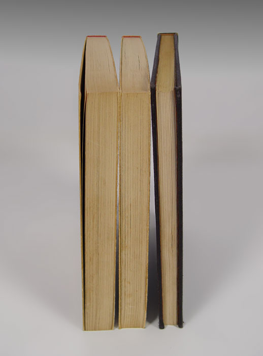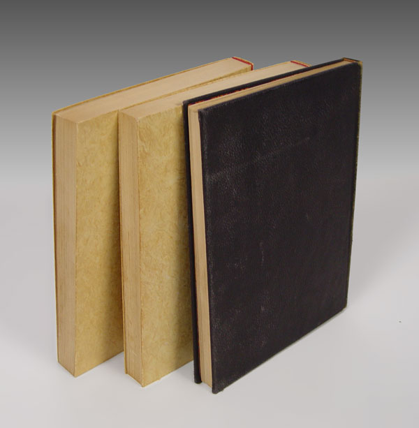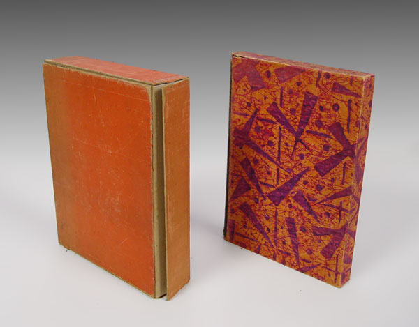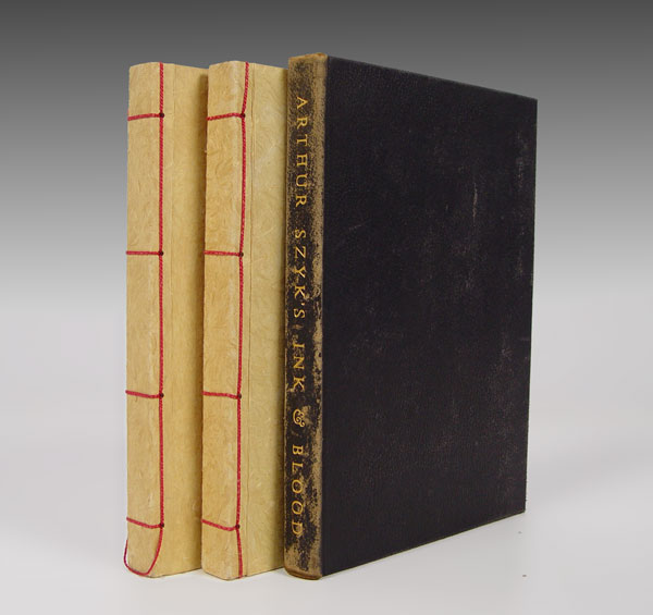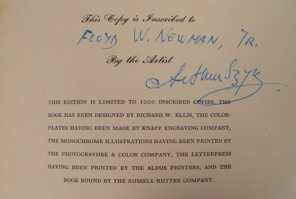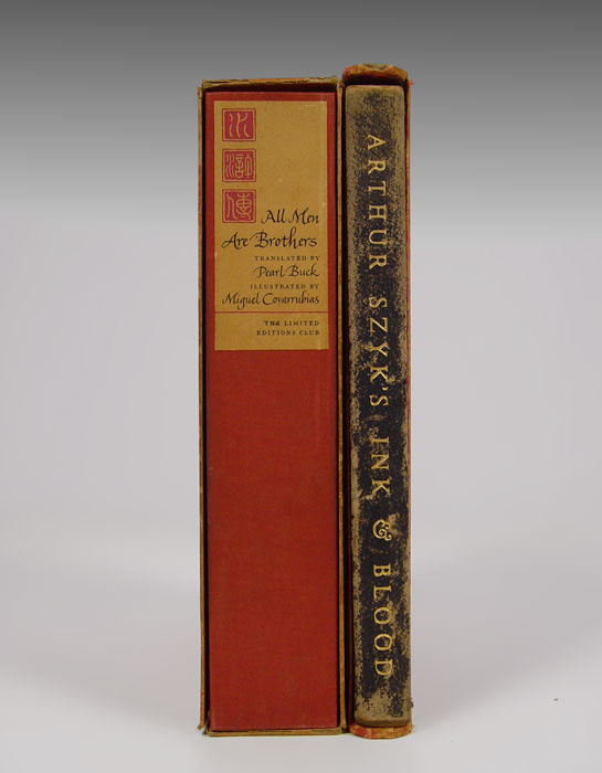 2 PIECE ART BOOKS: 1) Signed By Miguel Covarrubias. ALL MEN ARE BROTHERS [SHUI HU CHUAN] by Shi Nai-an and Lo Kuan-chung. Translated from the Chinese by Pearl S. Buck, with an Introduction by Lin Yutang and Illustrations by Miguel Covarrubias. New York: For the Members of The Limited Editions Club, 1948. 2 volumes. Of an edition of 1500 copies, this is No. 889. It is signed by the artist. Folio, bound oriental-style in string-tied flexible boards, paper labels, xxix, 350 pp. + [338] pp. Color plates. Very Good in a double slip case. 2) INK & BLOOD: A BOOK OF DRAWINGS by Arthur Szyk. With a Prefatory Text by Struthers Burt. New York: Heritage Press, 1946. One of 1,000 inscribed copies, signed by the author. Folio, full black morocco with gilt lettering on spine, batik-style purple & orange endpapers, 19 pp., 74 plates. Spine is much-rubbed, bears a former-owner bookplate, and with a musty smell; otherwise clean and tight in original, somewhat worn slip case.
