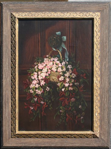 CIRCLE OF GEORGE HENRY HALL PAINTING OF FLOWERS HANGING ON A DOOR KNOB: OIL/Canvas, 27'' x 18'', no visible signature, encased in carved and painted frame, 36'' x 27''.