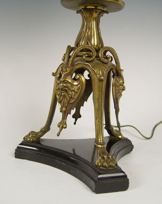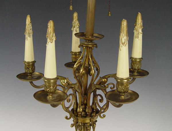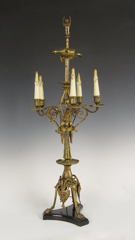 BRONZE TABLE TOP CANDELABRA LAMP: Tri legged paw foot base with horned masquerons, five arm candle holder centered by an electric lamp, winged griffin finial, 36''h., approx. 14'' dia. arm to arm.